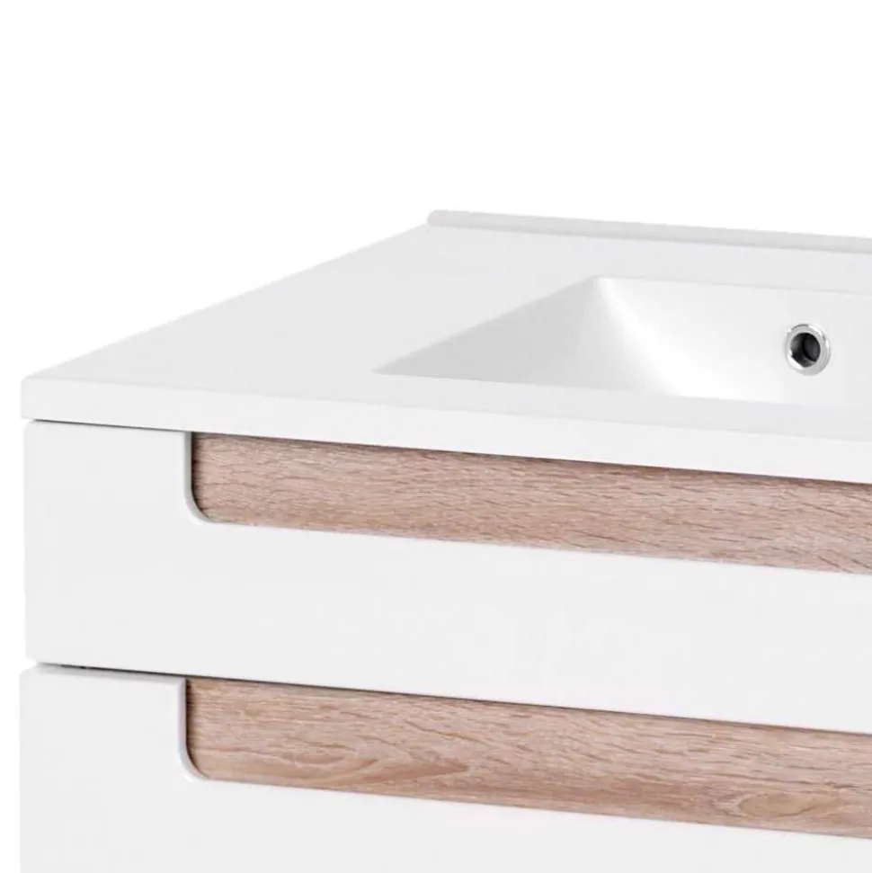 - Weiß lackierter Unterbeckenschrank mit eichefarbigen Griffmulden