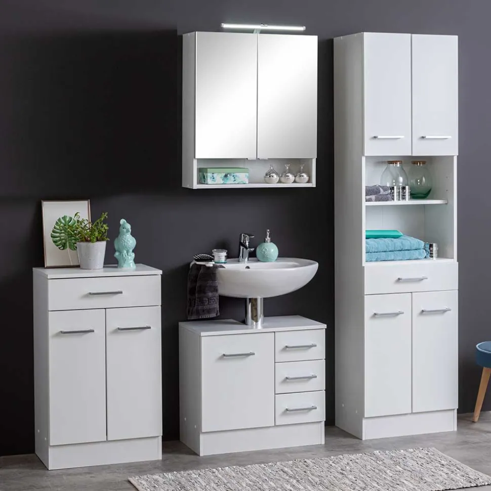 In ein frisch renoviertes Bad einzutreten und sofort Wohlbehagen zu spüren, gelingt mit diesem exklusiven Badezimmer-Set „Skiranov“. Hochschrank, Spiegelschrank, Unterschrank und Waschbeckenunterschrank bilden ein perfekt abgestimmtes Ensemble, das Ihr Badezimmer optisch vergrößert, optimal strukturiert und gleichzeitig mit großzügigem Stauraum bereichert. In strahlendem Weiß gehalten, wirkt das Set hell, zeitlos und einladend. Modernes Design zeigt sich hier in klaren Linien, harmonischen Proportionen und einer Formensprache, die Minimalismus mit skandinavischer Leichtigkeit verbindet. Breite, elegante Bügelgriffe aus Metall setzen stilvolle Akzente und erleichtern die Handhabung. Dieses Design schafft eine Atmosphäre, die sowohl Ruhe als auch Stil ausstrahlt – ideal, um den Tag entspannt zu beginnen oder ausklingen zu lassen.