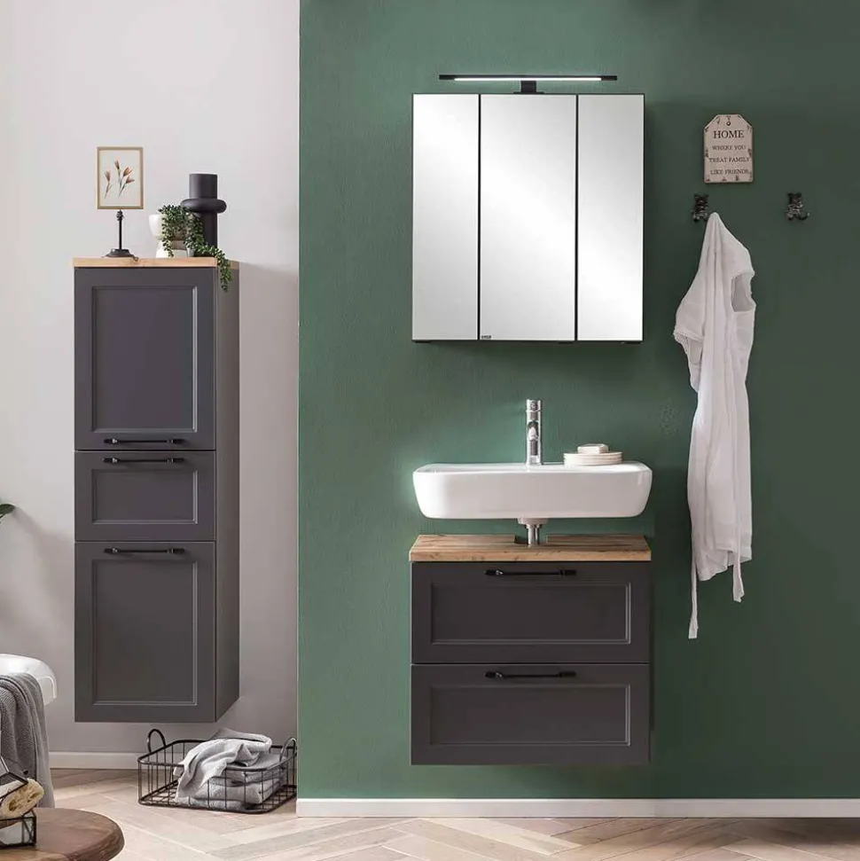 Ein Gefühl von Geborgenheit und natürlicher Harmonie entsteht, sobald der Landhausstil Einzug in Ihre Räume hält. Sanfte, klassische Linien und dekorative Details verleihen dem Badmöbel-Set „Novelya“ seinen besonderen Charakter. Die filigrane Kassettenoptik der Holzfronten erinnert an traditionelle Handwerkskunst und lässt eine wohnliche Wärme entstehen, die perfekt zu den Wildeichefarben passt. Gleichzeitig bringen die matt dunkelgrau folierten Fronten einen modernen Akzent ins Spiel, der das Design frisch und aktuell wirken lässt. So entsteht ein spannender Mix aus rustikalem Charme und zeitgemäßem Flair, der Ihr Badezimmer in eine Wohlfühloase verwandelt.