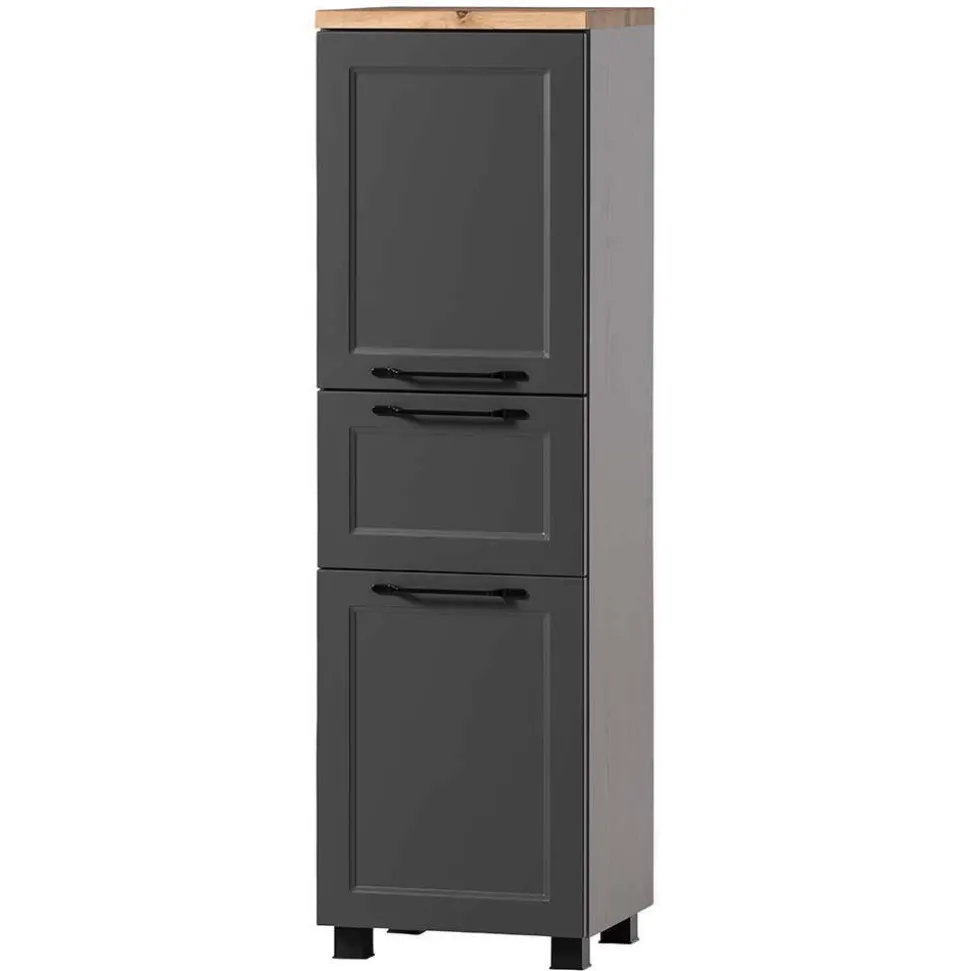 - Korpus melaminbeschichtet in Dunkelgrau und Holzoptik, Front dunkelgrau matt foliert