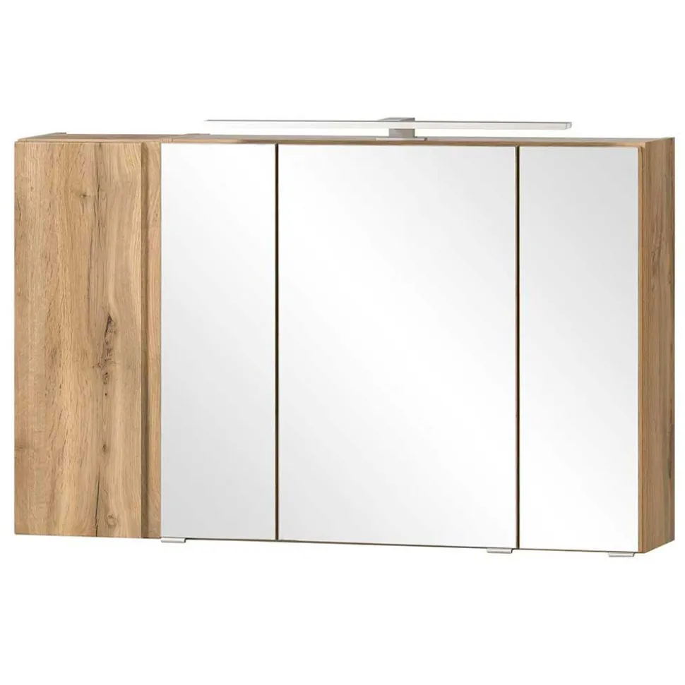 Ein großzügiger Spiegelschrank mit vier Türen schenkt nicht nur Spiegelfläche, sondern auch jede Menge Stauraum. Drei Türen sind mit hochwertigem Spiegelglas versehen und verbergen jeweils zwei verstellbare Glasböden, sodass Kosmetik und Pflegeprodukte immer griffbereit und dennoch ordentlich verstaut sind. Hinter der vierten, in Holzoptik gehaltenen Tür warten zwei stabile Einlegeböden aus Holzwerkstoff auf Ihre Badutensilien. Für stimmungsvolle Beleuchtung sorgt die integrierte LED-Leuchte, die mit 60 cm Breite, 4000 Kelvin, 6 Watt und 450 Lumen neutralweißes Licht spendet – ideal für die tägliche Pflege. Dank der Energieeffizienzklasse A bis A++ sparen Sie zusätzlich Strom. Eine integrierte Schalter-Steckdosenkombination rundet den Komfort ab und macht das Stylen oder Rasieren noch praktischer.