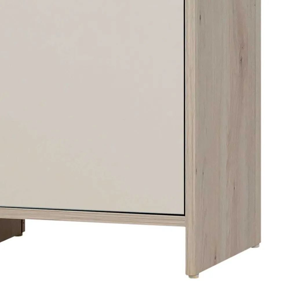 Ein stabiles Wangengestell bildet das solide Rückgrat des Schranks und sorgt für einen sicheren Stand. Kunststoff-Bodengleiter schützen empfindliche Böden vor Kratzern und erleichtern das Verschieben des Möbelstücks. Damit der Hochschrank auch bei unebenen Böden oder in Haushalten mit Kindern sicher steht, ist eine Kippsicherung zur Wandmontage im Lieferumfang enthalten – ein wertvolles Sicherheitsdetail, das bei hochwertigen Möbeln selbstverständlich ist.