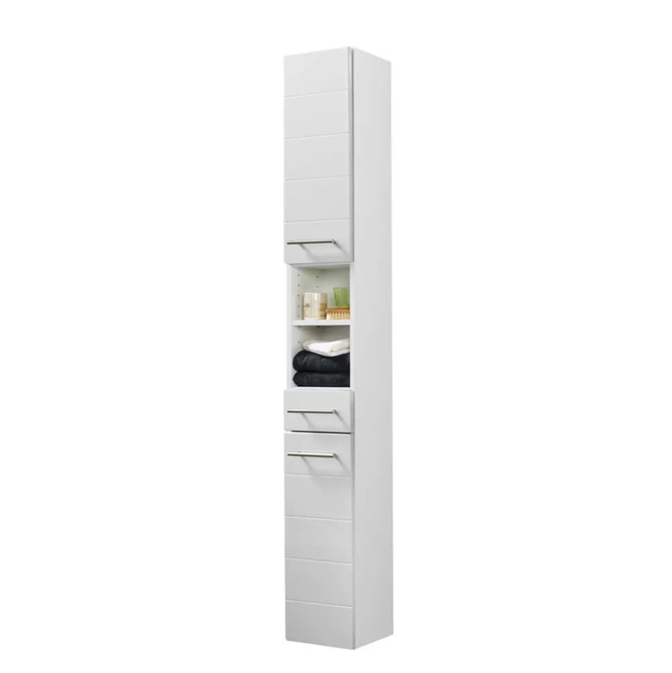 Mit dem Badezimmer-Hochschrank Veverino zieht zeitgemäßer Stil und clevere Raumnutzung in Ihr Bad ein. Klare Linien, eine elegante Kombination aus Weiß Hochglanz und Weiß melaminbeschichtetem Korpus sowie chromglänzende Metallgriffe machen dieses Möbelstück zu einem echten Hingucker – modern, stilvoll und dabei herrlich funktional.