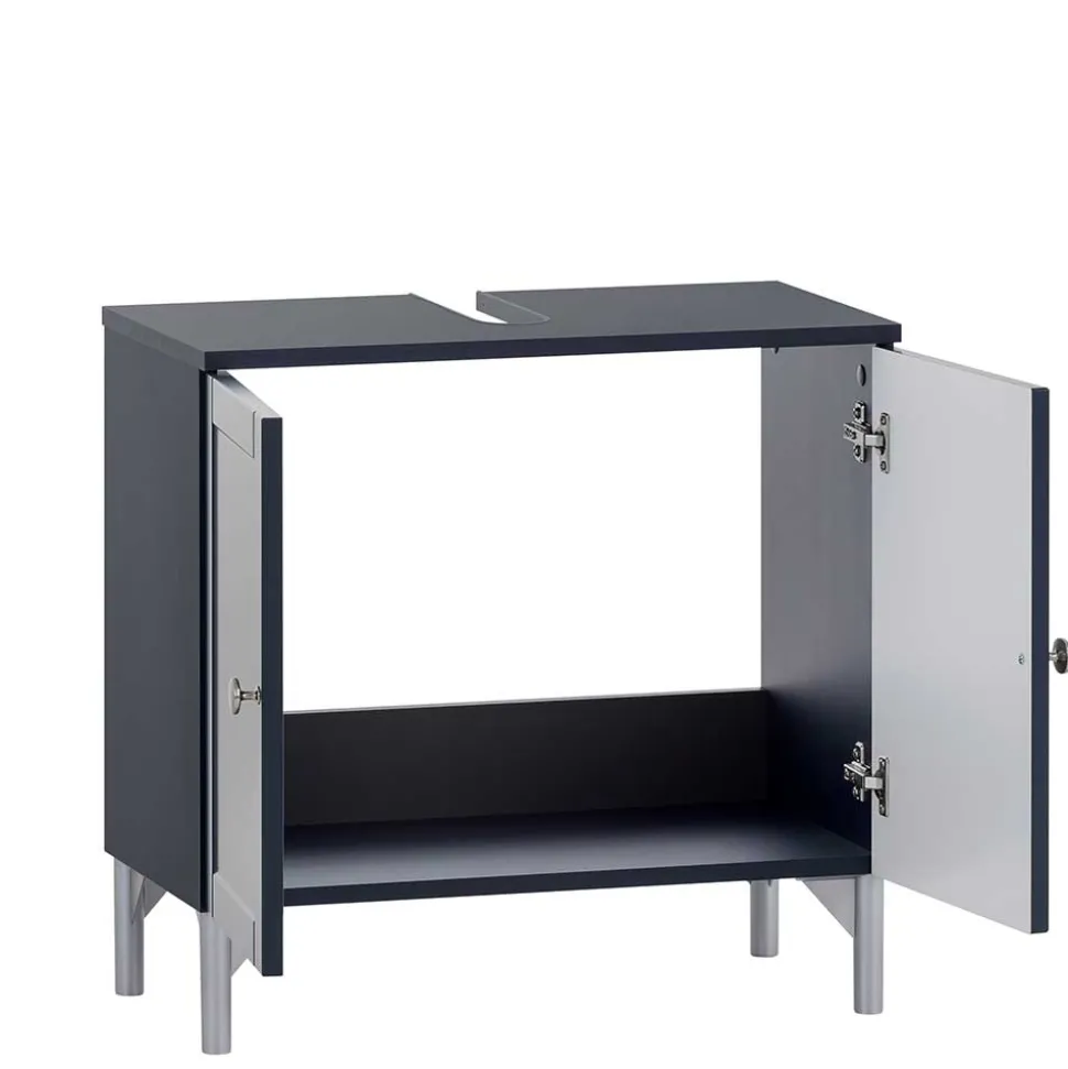 Ein großzügiges Staufach hinter zwei Drehtüren schafft Ordnung und hält den Blick auf das Wesentliche frei. Die Türen sind mit langlebigen Metallscharnieren ausgestattet, die auch bei täglichem Gebrauch ihre Formstabilität und Leichtgängigkeit behalten. Die offene Rückwand erleichtert die Installation von Wasser- und Abflussleitungen erheblich – kein mühsames Anpassen oder Bohren notwendig. Ein passgenauer Siphonausschnitt in der Deckplatte (BxT: ca. 6 × 22,5 cm) macht den Einbau noch komfortabler. Auf stabilen Kunststofffüßen in matt nickelfarbener Lackierung steht der Schrank sicher, während 12 cm Bodenfreiheit nicht nur optisch Leichtigkeit schaffen, sondern auch die Reinigung unter dem Möbel erleichtern. Wichtiger Hinweis: Lieferung erfolgt ohne Waschbecken – so haben Sie freie Wahl bei Form und Material.