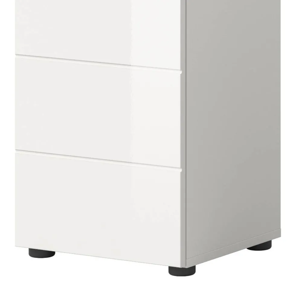 Gefertigt aus robusten Spanplatten für den Korpus und MDF für die Front bietet „Vitablos“ langlebige Qualität. Die Front ist hochglänzend lackiert, während alle Oberflächen melaminbeschichtet und foliert sind. Dekor an den Kanten ist tiefgezogen, wodurch eine besonders saubere und ästhetische Optik entsteht. Die schwarzen Kunststofffüße sorgen für sicheren Stand und eine leichte Bodenfreiheit von 2 cm, wodurch der Schrank auch optisch leicht wirkt.