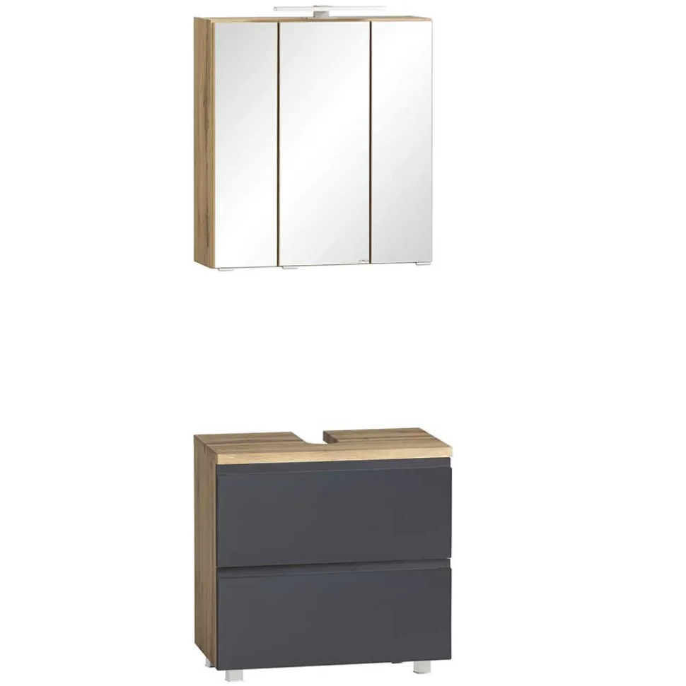 Ein edler Mix aus mattem Dunkelgrau und warmen Wildeichefarben prägt das Erscheinungsbild dieses Möbelsets und verleiht dem Badezimmer eine stilvolle und moderne Ausstrahlung. Das matte Dunkelgrau der Fronten strahlt Ruhe, Klarheit und zeitlose Eleganz aus, während die wildeichefarbene Holzoptik des Korpus für natürliche Wärme und Wohnlichkeit sorgt. Diese harmonische Kombination schafft ein Ambiente, das sowohl puristische als auch gemütlichere Einrichtungsstile ergänzt. Die klare Linienführung unterstreicht das moderne Design und verleiht dem Raum eine aufgeräumte, großzügige Wirkung. So entsteht eine Badumgebung, die nicht nur praktisch, sondern auch optisch eine wahre Bereicherung ist.
