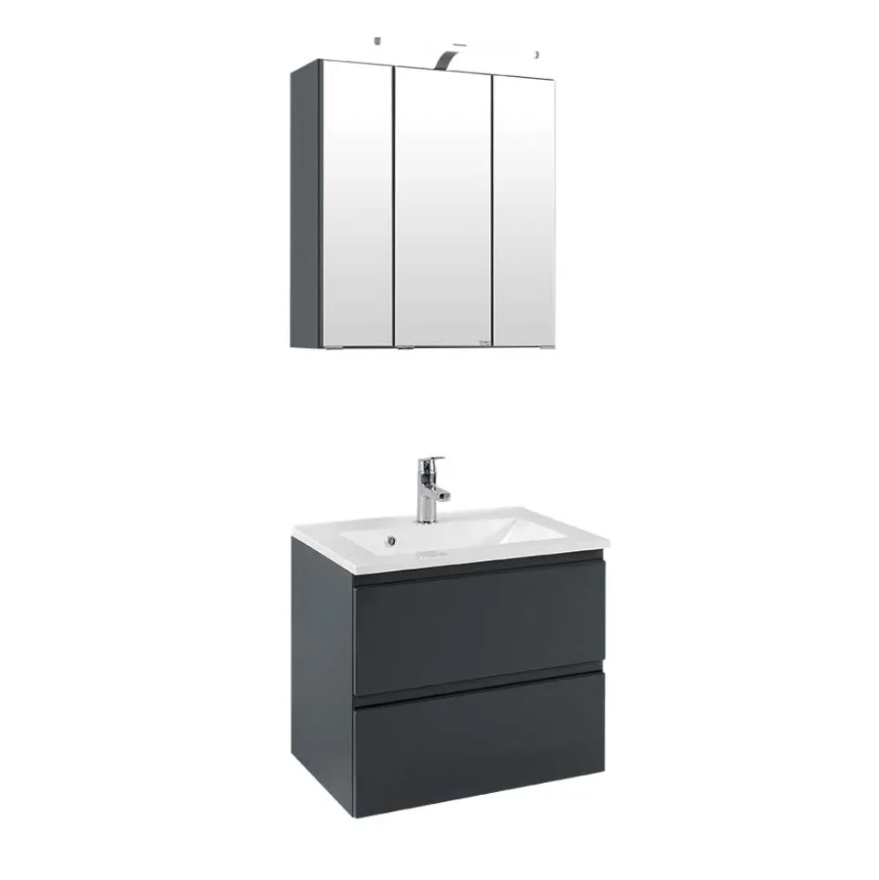 Klare Linien, reduzierte Formen und eine zurückhaltend elegante Farbgebung prägen das Erscheinungsbild dieser Möbel. Die hochglanzveredelten Fronten in edlem Anthrazit setzen luxuriöse Akzente, während der Korpus in matter anthrazitfarbener Melaminbeschichtung für eine stilvolle, moderne Ergänzung sorgt. Melaminbeschichtungen zeichnen sich durch ihre robuste, besonders pflegeleichte Oberfläche aus, die Kratzern und Feuchtigkeit trotzt – ideal also für den täglichen Einsatz im Badezimmer.