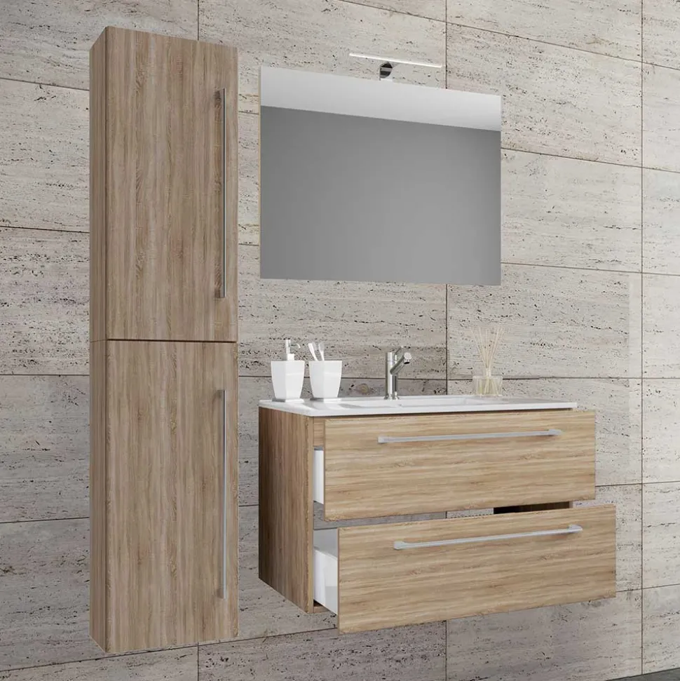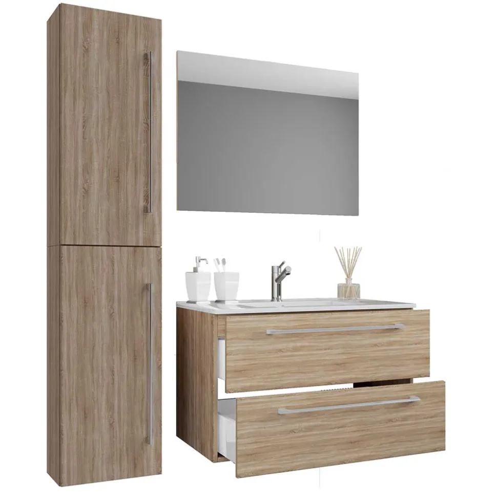 Die dreiteilige Kombination besteht aus einem Hochschrank, einem Spiegel und einem Waschtisch. Alle Elemente sind so konzipiert, dass sie selbst in kleinen Bädern maximalen Stauraum und Komfort bieten. Dank platzsparender Wandmontage bleibt der Raum luftig und modern.