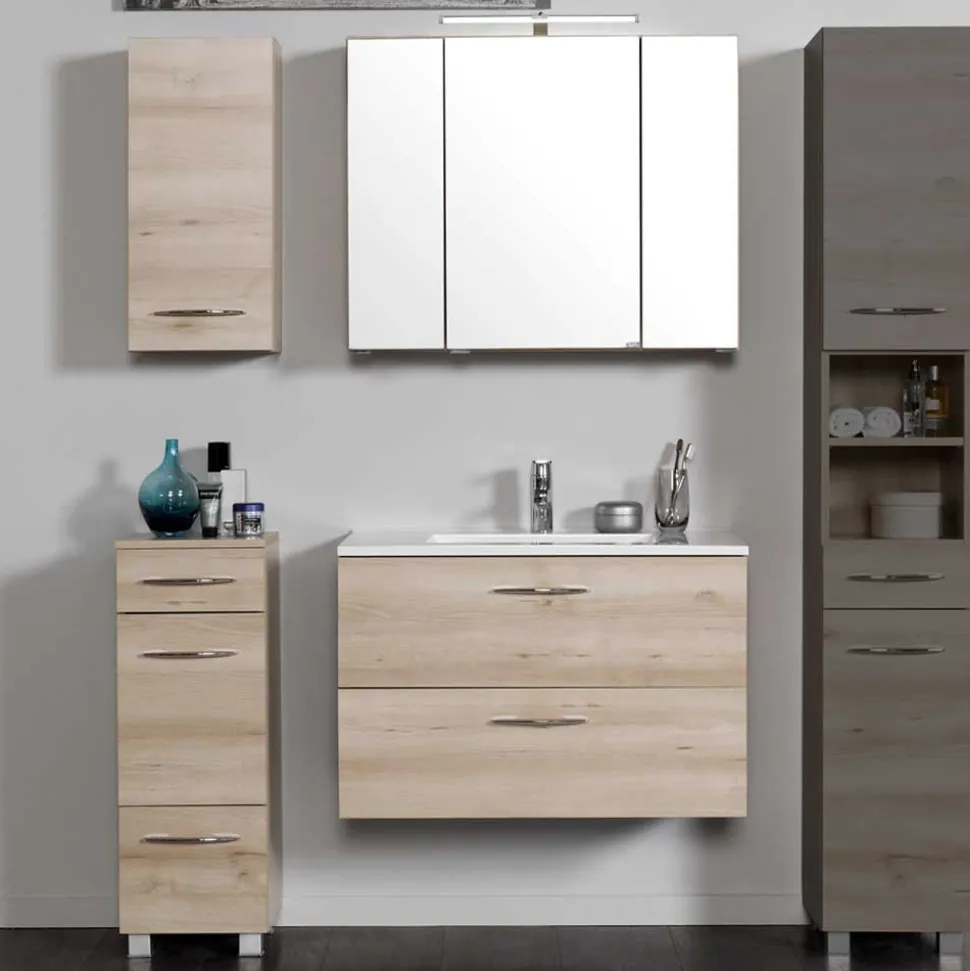 Ihr Badezimmer ist mehr als ein funktionaler Raum – es ist Ihr Rückzugsort, Ihr Startpunkt in den Tag, Ihr ganz persönlicher Wohlfühlplatz. Mit dem Badmöbel Set „Mabeca“ holen Sie sich genau diese Kombination aus Stil, Stauraum und Qualität in Ihre vier Wände. Bestehend aus einem Hängeschrank, einem Spiegelschrank, einem Waschtisch mit elegantem Waschbecken und einem praktischen Unterschrank, verwandelt dieses Set Ihr Bad in eine moderne Wohlfühloase – auf Wunsch wandhängend oder bodenstehend.