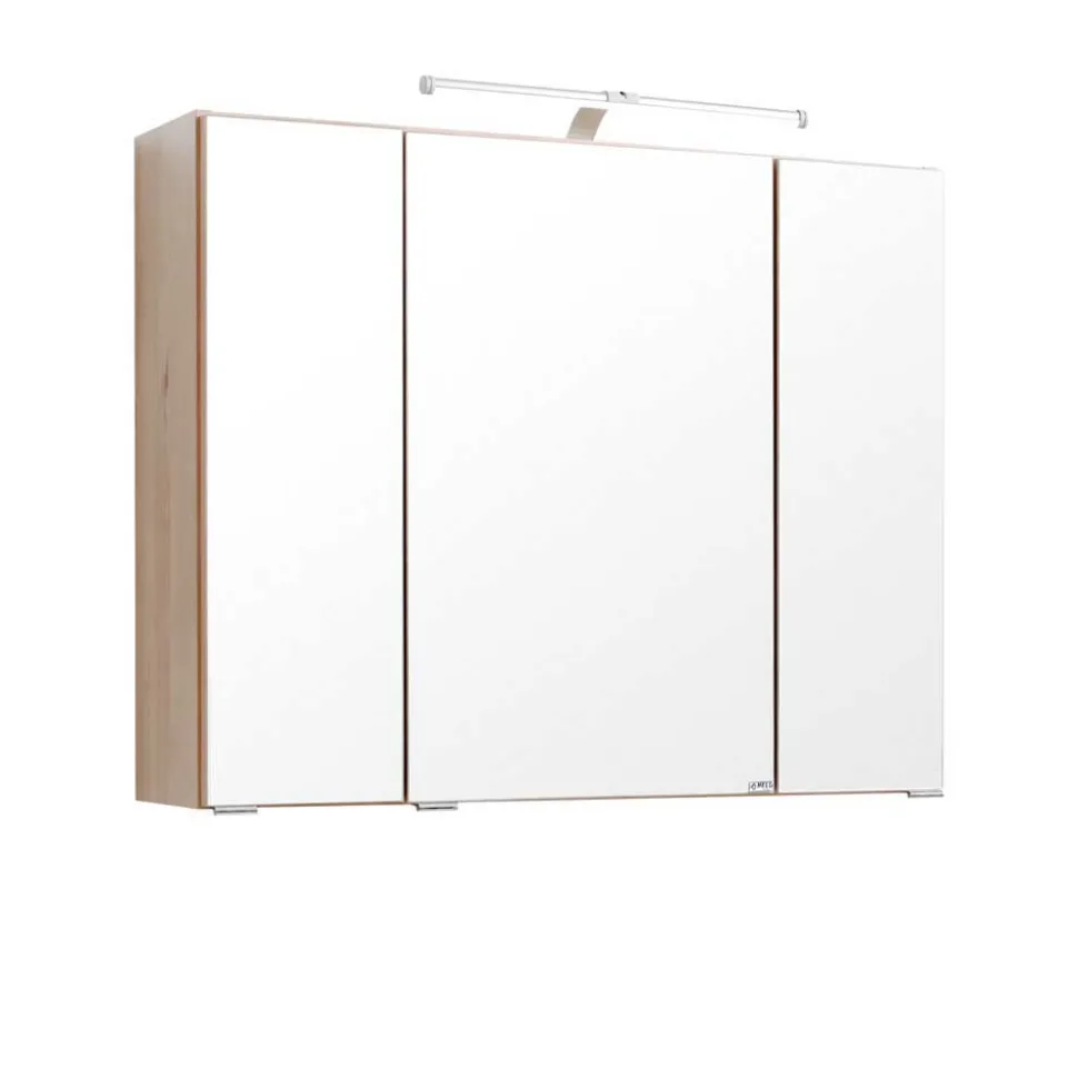 Klares Design trifft wohnliche Wärme: Das hellbuchefarbene Holzdekor in Kombination mit der vollverspiegelten Spiegelschrankfront verleiht dem Set eine harmonische Optik, die sowohl moderne als auch klassische Bäder aufwertet. Die geradlinige Formsprache, minimalistischen Griffe und die sanft reflektierenden Oberflächen fügen sich nahtlos in jeden Raum ein. „Mabeca“ setzt auf modernes Understatement – elegant, unaufdringlich und funktional.
