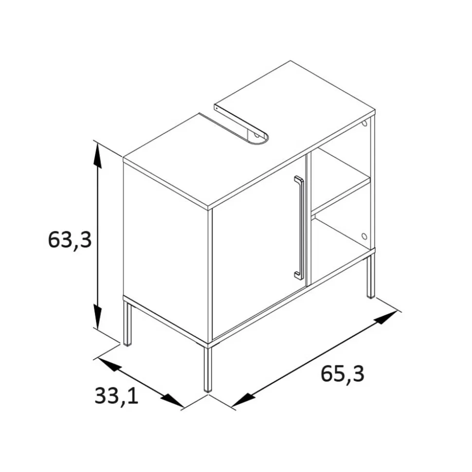 - Waschbeckenunterschrank (65x63x33 cm): Clever gestaltet und funktional durchdacht bietet dieser Unterschrank hinter der Tür ein geräumiges Fach mit offener Rückwand, ideal für Reinigungsmittel oder größere Flaschen. Zusätzlich gibt es zwei offene Fächer, die für dekorative oder nützliche Accessoires genutzt werden können. Der vorgefertigte Siphonausschnitt in der Deckplatte ermöglicht eine einfache Montage und lässt Ihnen die Wahl des Waschbeckens. Ein Unterschrank, der jedes Bad aufgeräumter und eleganter wirken lässt.