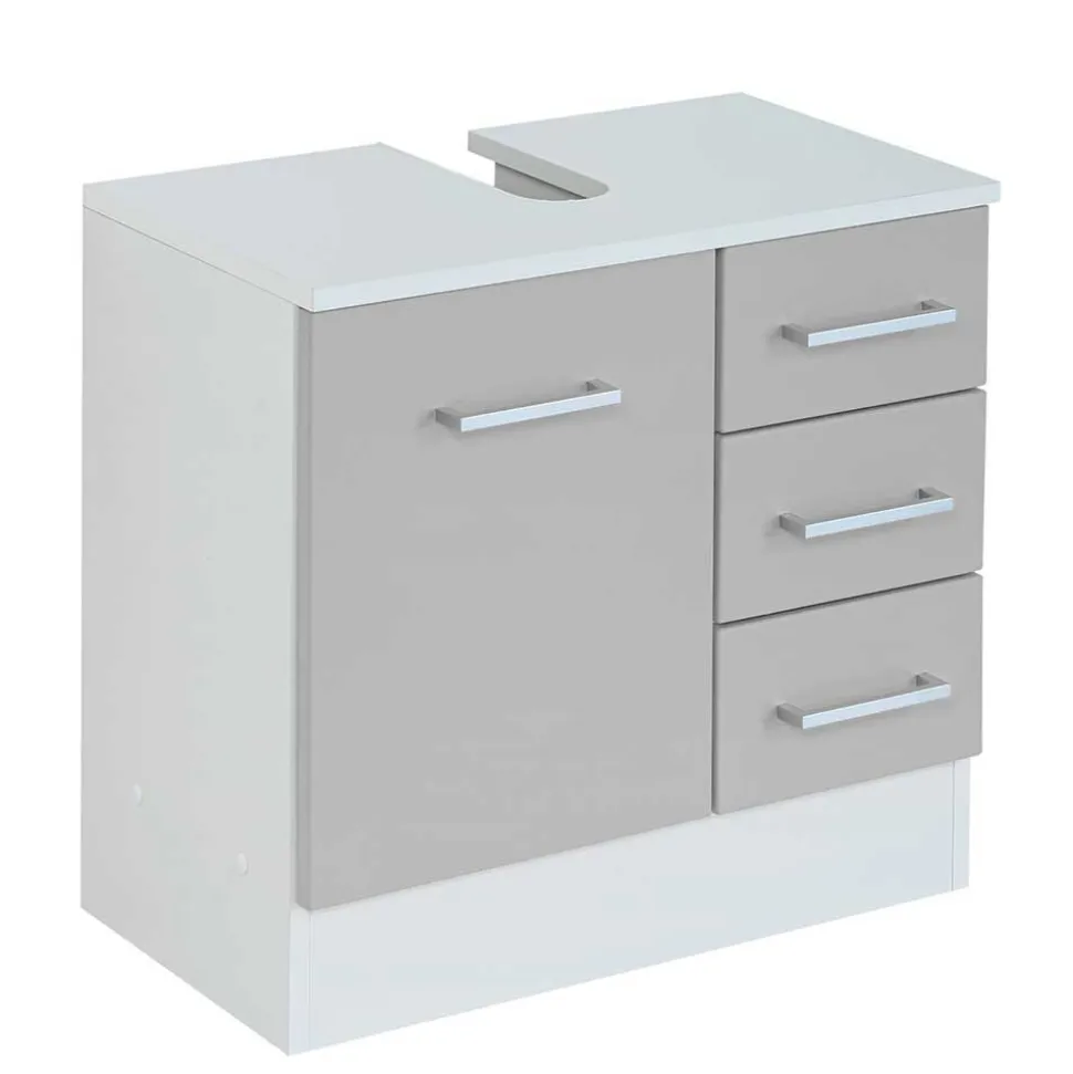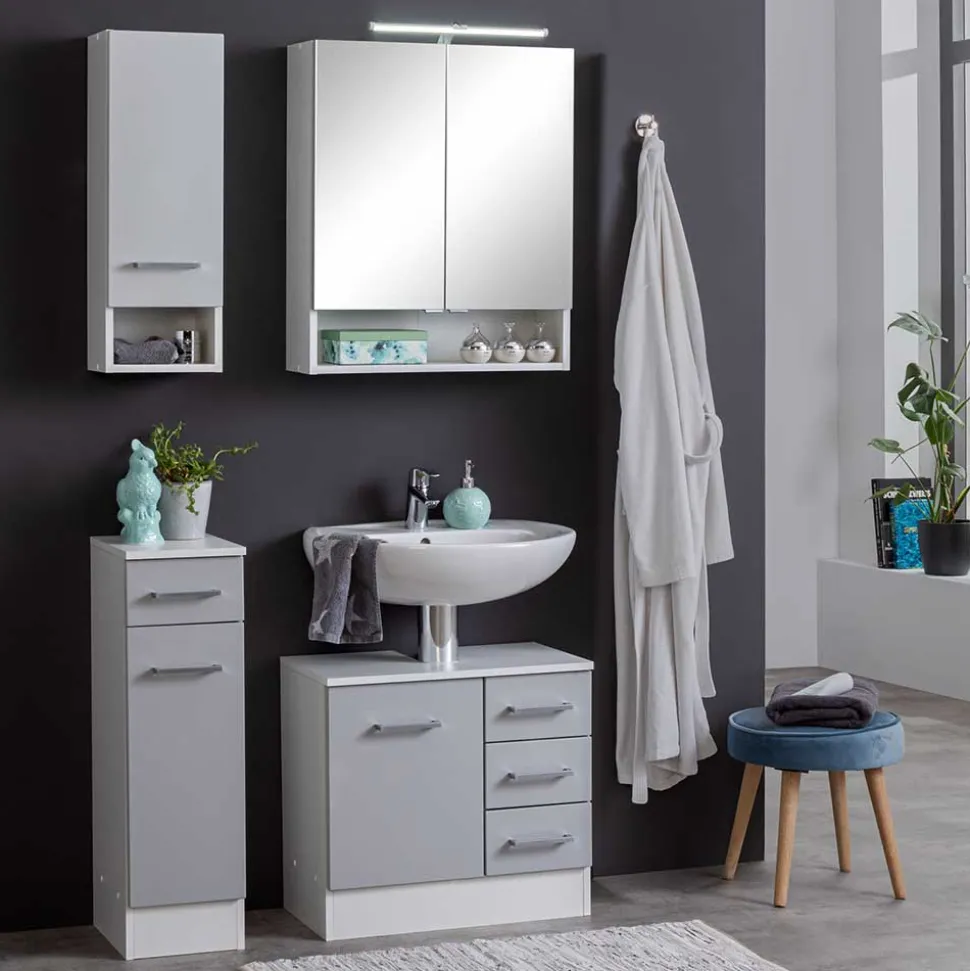 Modernes Design zeichnet sich durch klare Linien, reduzierte Formen und funktionale Eleganz aus. Genau das spiegelt sich im Badmöbel-Set „Girios“ wider. Die Kombination aus Weiß und Hellgrau verleiht Ihrem Badezimmer eine helle, freundliche und zugleich sehr moderne Atmosphäre. Die Fronten in stilvollem Hellgrau sind hochwertig foliert, während der Korpus mit einer robusten, pflegeleichten Melaminbeschichtung in strahlendem Weiß versehen ist. Diese Beschichtung schützt die Oberflächen effektiv vor Feuchtigkeit und macht sie besonders widerstandsfähig im Alltag.