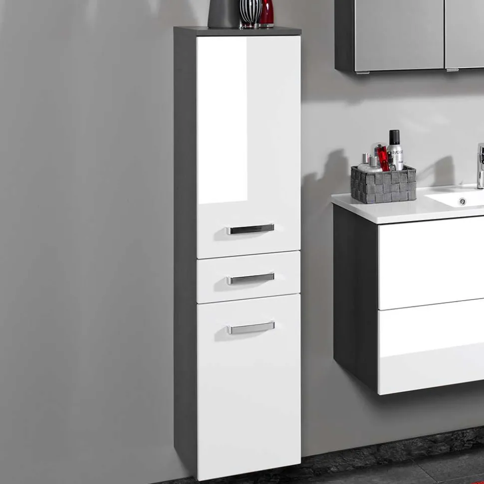 Kompakte Maße von 30x79x35 cm machen diesen Schrank zum idealen Begleiter in Ihrem Bad. Hinter der Tür mit Einlegeboden und mit zusätzlicher Schublade mit Metall-Vollauszug und Softclose bietet er Platz für Handtücher, Kosmetik oder Alltagsutensilien. Zwei formschöne Metallgriffe unterstreichen den eleganten Look.