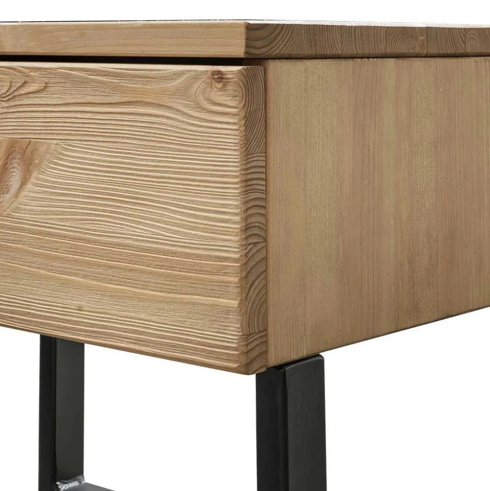 Das Bügelgestell aus Metall mit dekorativen Holz Inlays verleiht dem Bett zusätzliche Raffinesse. Holzoberflächen sind natürlich geölt, während die Metallelemente in Schwarz pulverbeschichtet sind. Astlöcher, Unebenheiten und Wuchsrisse werden bewusst betont, um den rustikalen Charme zu unterstreichen.