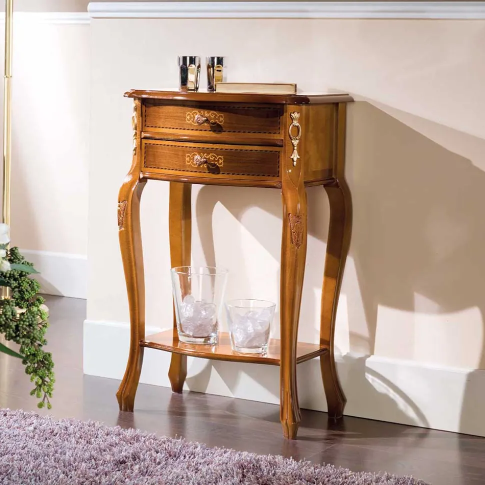 Die Oberflächen des Tisches sind mit echtem Nussbaumholzfurnier überzogen und komplett lackiert, was ihnen eine warme, ansprechende Optik verleiht. Die Fronten bestechen durch majestätisch florale Muster in Form von handgearbeiteten Intarsien, einem Zeugnis echter Handwerkskunst, das die einzigartige Schönheit dieses Möbelstücks unterstreicht.