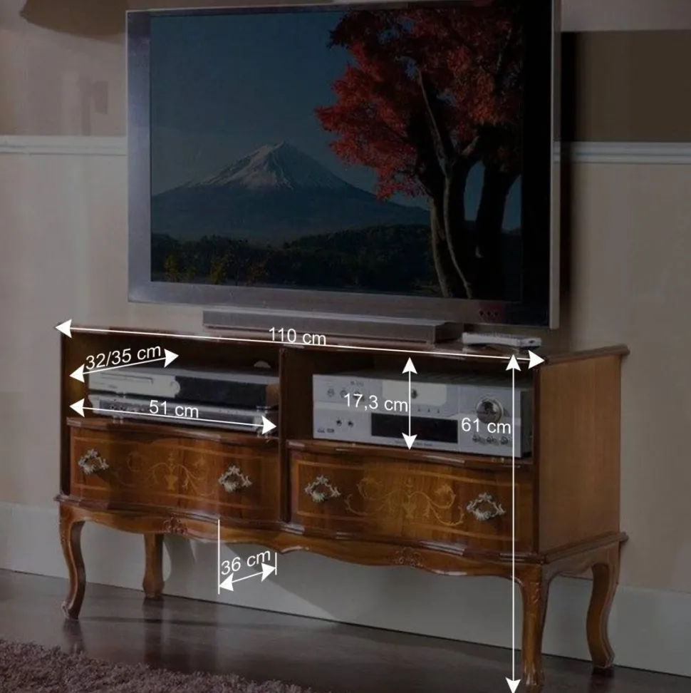 Die MDF-Oberflächen sind mit edlem Nussbaumholz furniert, was dem Möbelstück eine warme, natürliche und luxuriöse Ausstrahlung verleiht. Eine zusätzliche Lackierung schützt die Holzoberflächen vor Abnutzung und bewahrt die Schönheit des TV-Boards über Jahre hinweg. Was dieses Möbelstück besonders hervorhebt, sind die kunstvoll handgearbeiteten Intarsien und meisterhaften, floralen Einlegearbeiten an der Front, die in Verbindung mit den gerundeten Korpuskanten den eleganten Gesamteindruck perfektionieren.