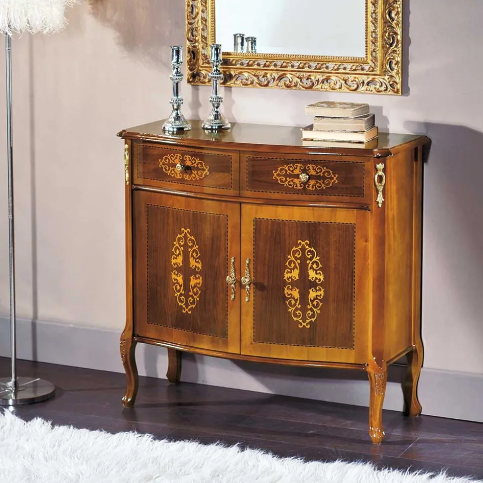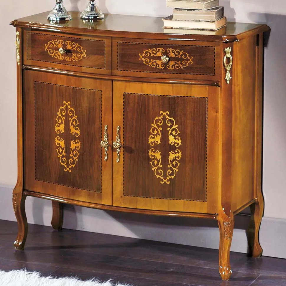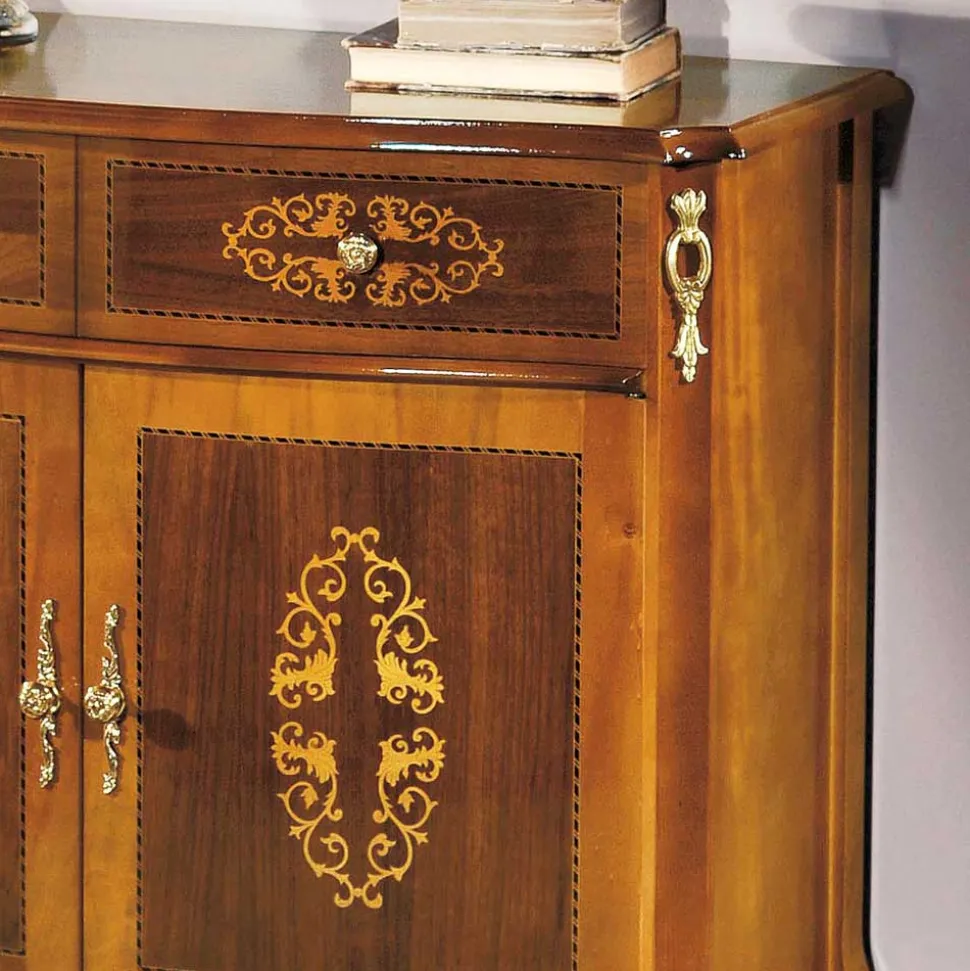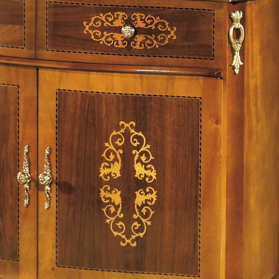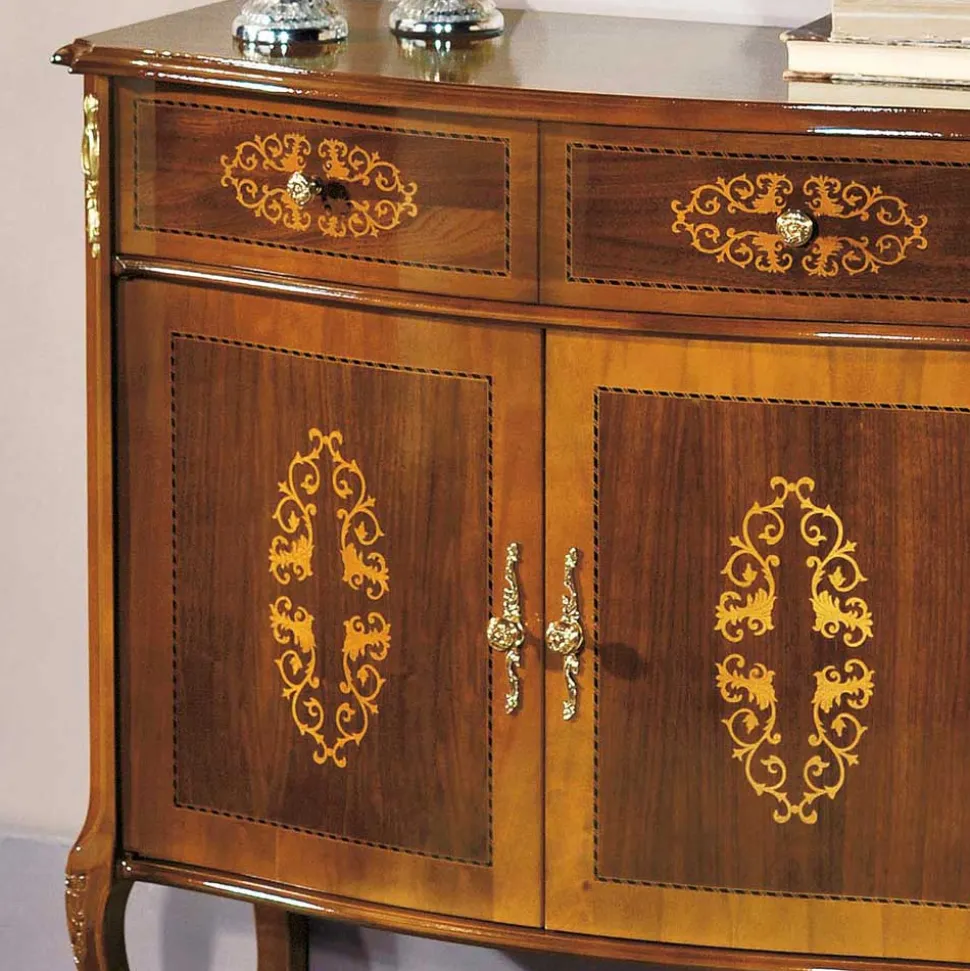 Die Oberflächen sind mit echtem Nussbaumholzfurnier veredelt und vollständig lackiert, was ihnen eine exquisite und langlebige Ausstrahlung verleiht. Jedes Detail der Kommode, von den majestätisch floralen Mustern der handgearbeiteten Intarsien bis hin zu den sorgfältig verarbeiteten Korpuskanten, zeugt von tiefem Respekt für traditionelle Handwerkskunst.