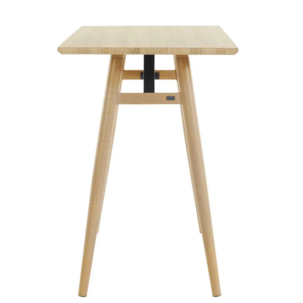 Das abgespreizte Fußgestell mit konisch zulaufenden Beinen verleiht dem Tisch nicht nur eine stilvolle Silhouette, sondern sorgt auch für optimale Standfestigkeit. Die abgeschrägte Stellung verteilt das Gewicht gleichmäßig und verleiht dem Möbelstück eine visuelle Leichtigkeit, die perfekt zum skandinavischen Gesamtkonzept passt.
