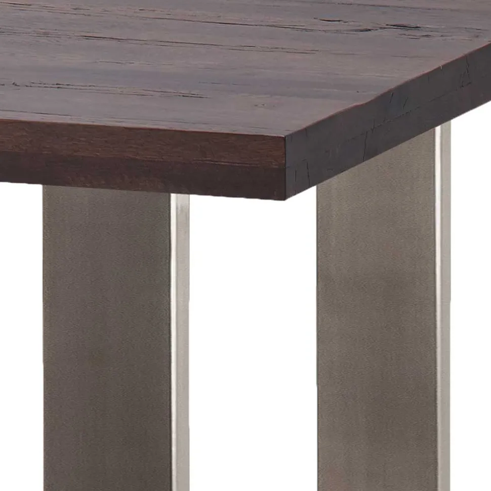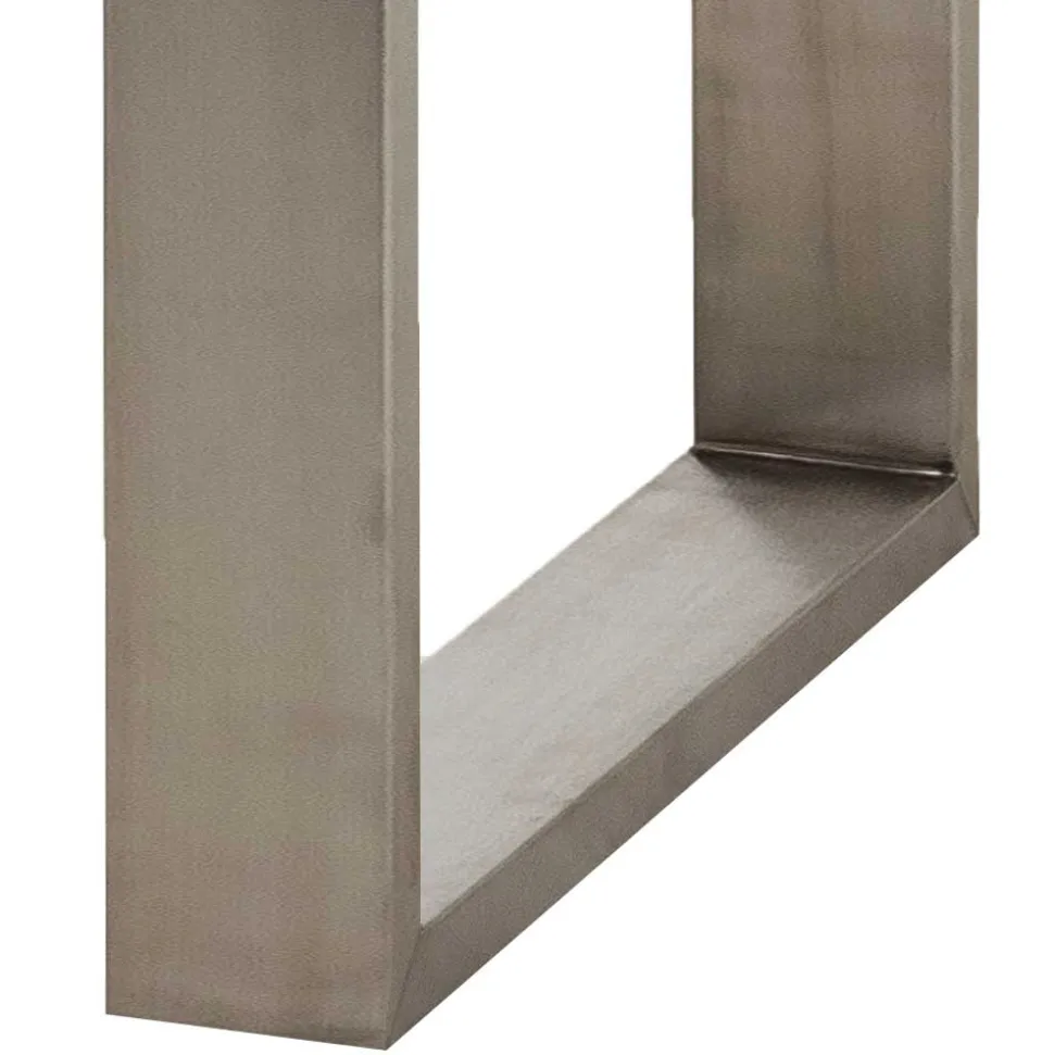 Verarbeitung von Edelstahl im Bürstverfahren verleiht dem Gestell eine moderne, matte Oberfläche mit feiner Struktur. Beim Bürsten wird die Metalloberfläche mit rotierenden Draht- oder Nylonbürsten behandelt, wodurch feine Linien entstehen und die Oberfläche eine seidenmatte Haptik erhält. Diese Technik macht das Metall robuster gegen Gebrauchsspuren und verleiht ihm gleichzeitig eine hochwertige, elegante Optik. Die Form des Gestells wird durch großzügige Vierkantrohre im Format 120 x 40 mm definiert. Diese Dimensionen garantieren eine hohe Stabilität und lassen den Tisch kraftvoll und zugleich modern wirken.
