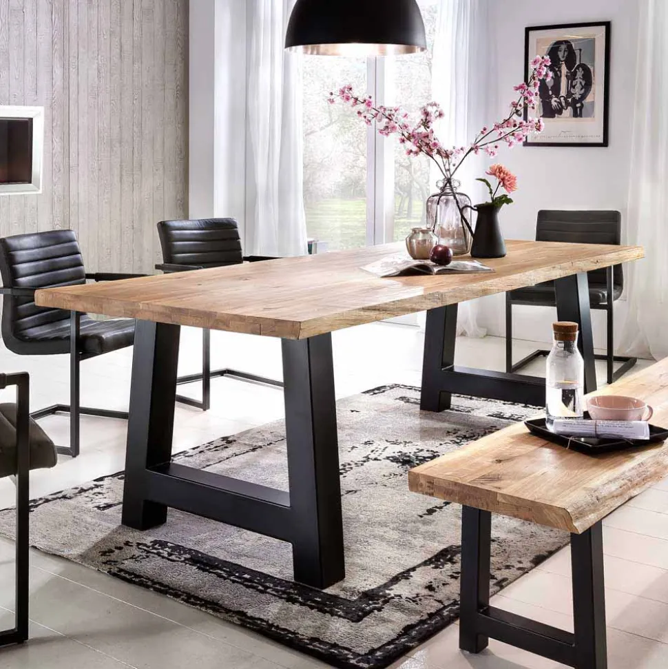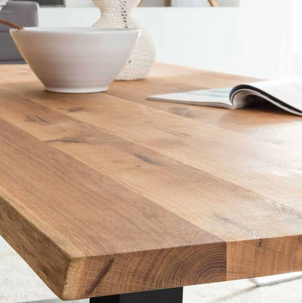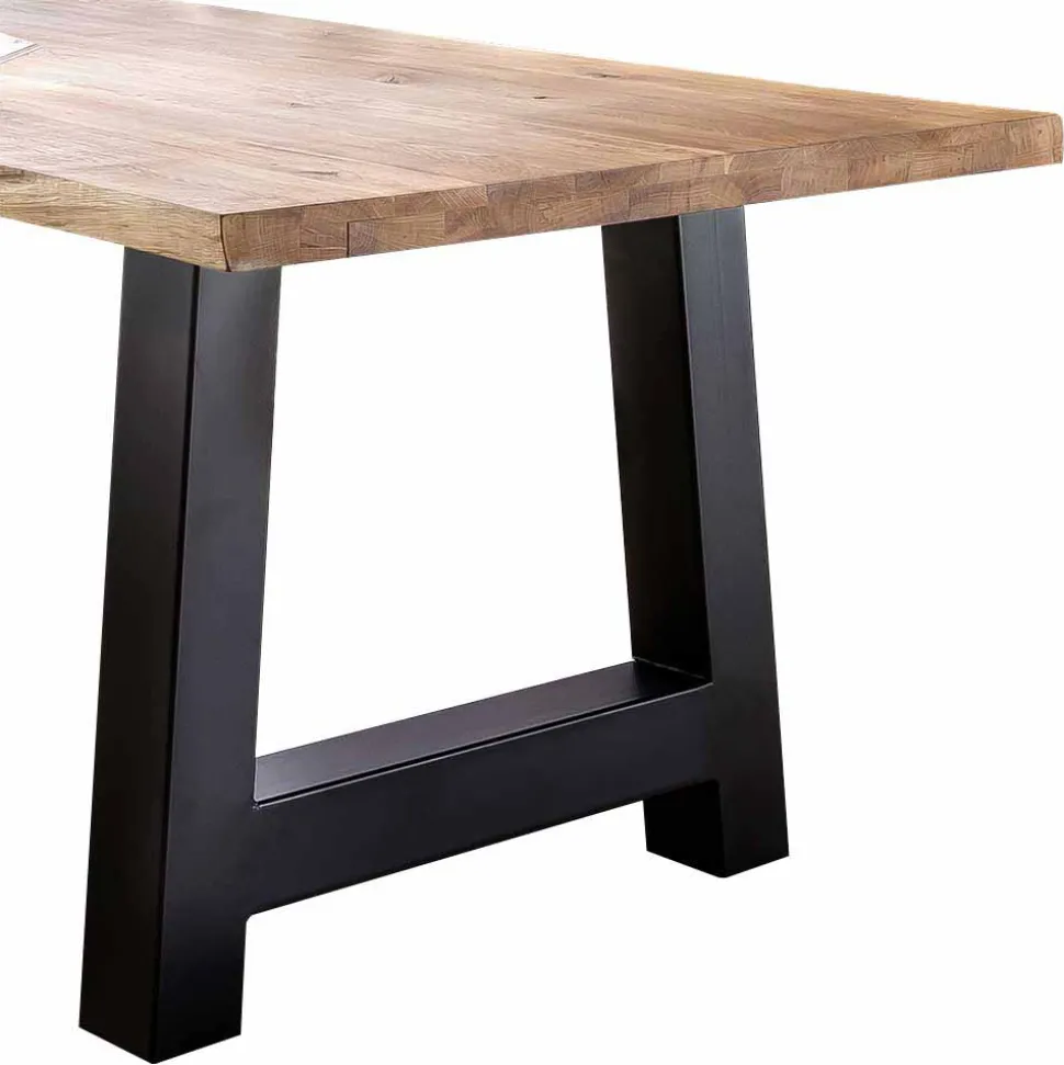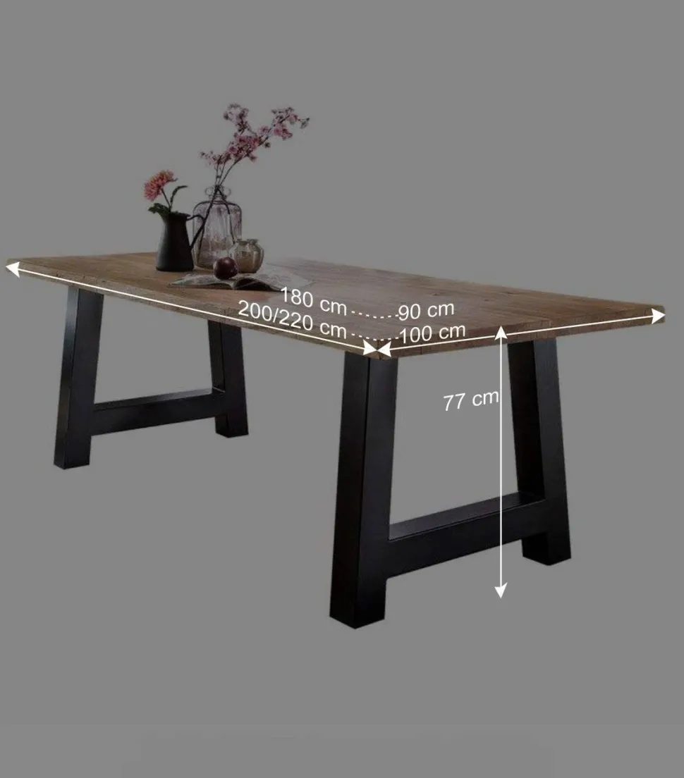 Mit einer Höhe von 77 cm und wählbaren Breiten zwischen 180 cm und 220 cm passt sich der „Morienta“ Tisch flexibel an verschiedene Raumgrößen und Stile an. Die solide Tischplatte aus massivem Eichenholz zeigt mit einer Stärke von ca. 2 cm und am Rand aufgedoppelt auf ca. 4,5 cm, dass hier Wert auf Qualität und sorgfältige Verarbeitung gelegt wurde. Das A-Form Gestell aus pulverbeschichtetem Eisen garantiert nicht nur Standfestigkeit, sondern fügt sich auch harmonisch in das Gesamtbild ein.