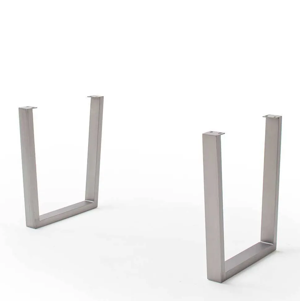 Das stabile Bügelgestell aus Edelstahl besticht durch seine gebürstete Oberfläche und das Trapez-Design. Die breiten Bodenauflagen der Bügelbeine sorgen für einen sicheren Stand und unterstreichen die moderne Ästhetik des Tisches. Bei den Varianten 002 und 003 sind die Beine versetzt montierbar, was zusätzliche Flexibilität bei der Gestaltung Ihres Essbereichs bietet.