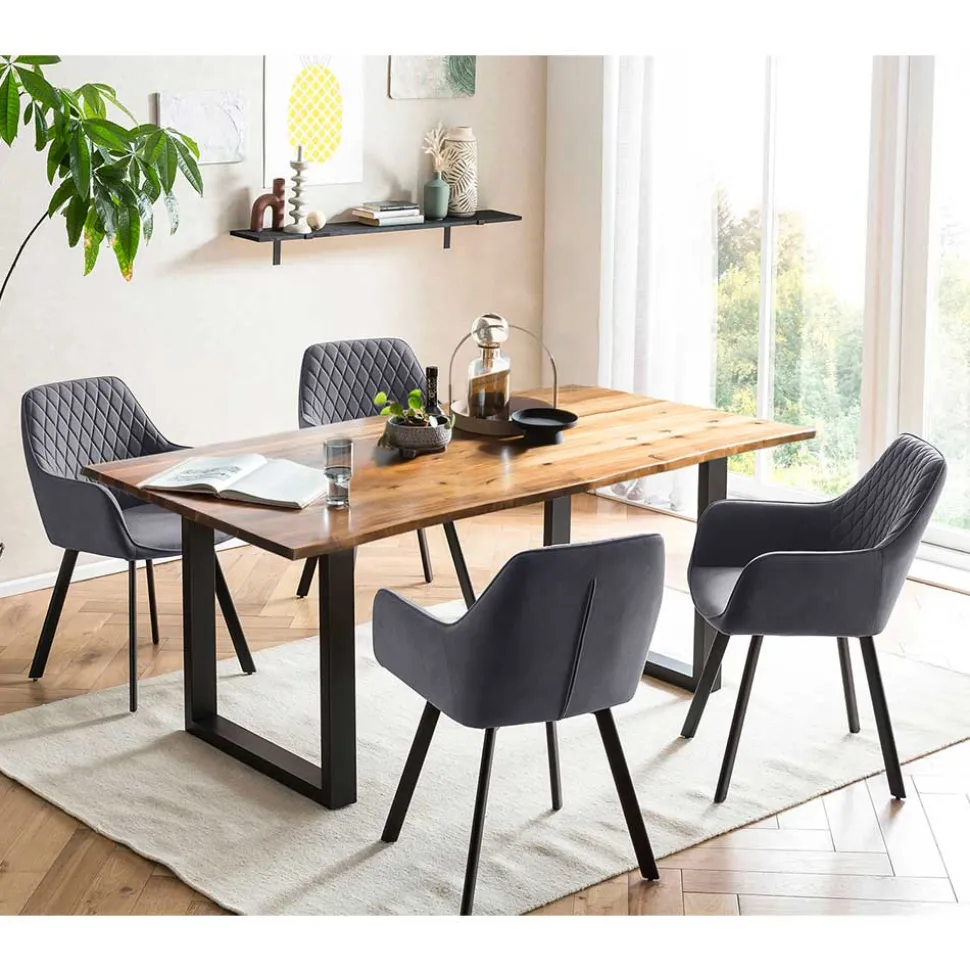 Bestehend aus vier stilvoll gestalteten Stühlen und einem eindrucksvollen Tisch wird die Sitzgruppe Lago zum Mittelpunkt jedes Essbereichs. Ob für ein gemeinsames Abendessen mit der Familie, einen gemütlichen Abend mit Freunden oder den ersten Kaffee am Morgen – Lago bietet den idealen Rahmen für alle Anlässe. Die harmonische Kombination aus cognacfarbenem Holz, grauem Samt und schwarzem Metall strahlt eine moderne, zugleich warme Atmosphäre aus und bringt urbanen Charme direkt ins Zuhause.