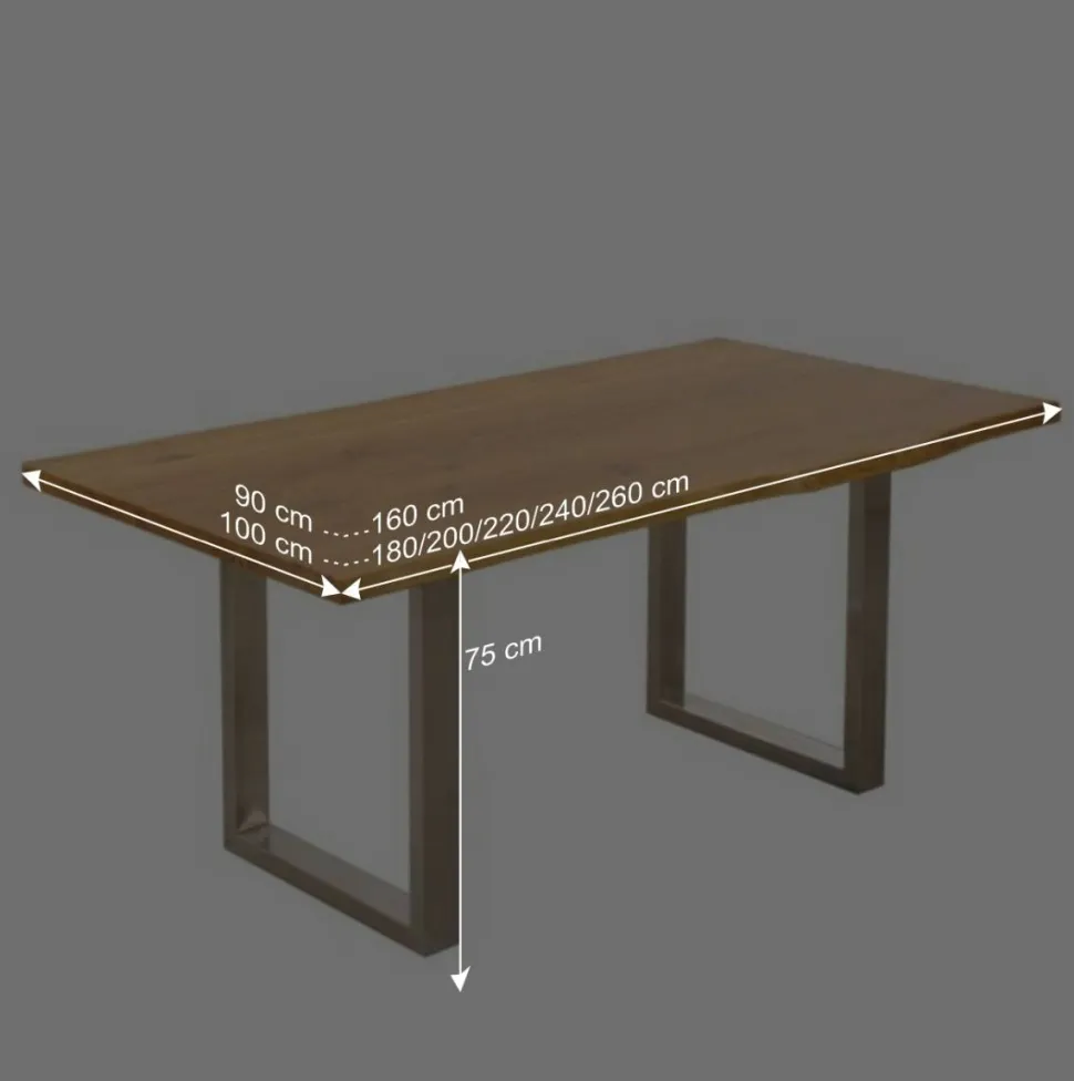 Der Esstisch „Cantinos“ besticht durch seine klassische, rechteckige Formgebung, die durch die einzigartige Baumkante, ein natürlicher, ungeschnittener Rand des Holzes, abgerundet wird. Jeder Tisch ist ein Unikat, geprägt von der individuellen Form und Textur der Baumkante. Diese Baumkante verleiht dem Tisch seinen besonderen Charme und macht ihn zu einem echten Hingucker in jedem Esszimmer.