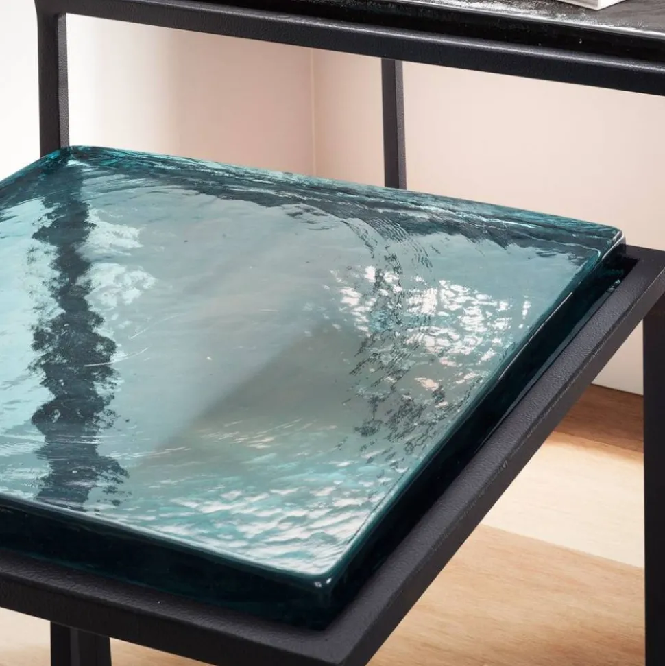 - Tischplatten aus blau eingefärbtem Glas mit Struktur, Stärke ca. 2,5 cm