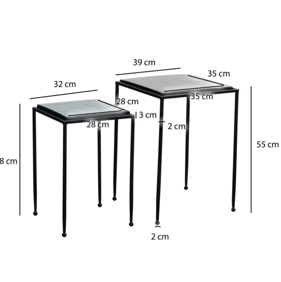Die Maße der beiden Tische sind perfekt aufeinander abgestimmt: Der große Tisch hat eine Breite von 39 cm, eine Tiefe von 39 cm und eine Höhe von 55 cm. Der kleinere Tisch misst 32 cm in der Breite, 32 cm in der Tiefe und 48 cm in der Höhe. Diese handlichen Größen ermöglichen es Ihnen, das Set flexibel in verschiedenen Räumen zu integrieren – ob im Wohnzimmer, im Flur oder sogar im Schlafzimmer als praktische Ablagefläche.