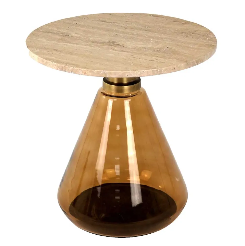Der kegelförmige Sockel aus braun getöntem Glas trägt die Marmorplatte mit Leichtigkeit und Anmut. Das zarte Schimmern des Glases verleiht dem Tisch eine fast schwebende Wirkung, während die Metallmanschette oben einen stilvollen Akzent setzt und das Design perfekt abrundet. Diese Kombination aus Transparenz, Wärme und Glanz verleiht jedem Raum eine luxuriöse, aber zugleich wohnliche Atmosphäre.