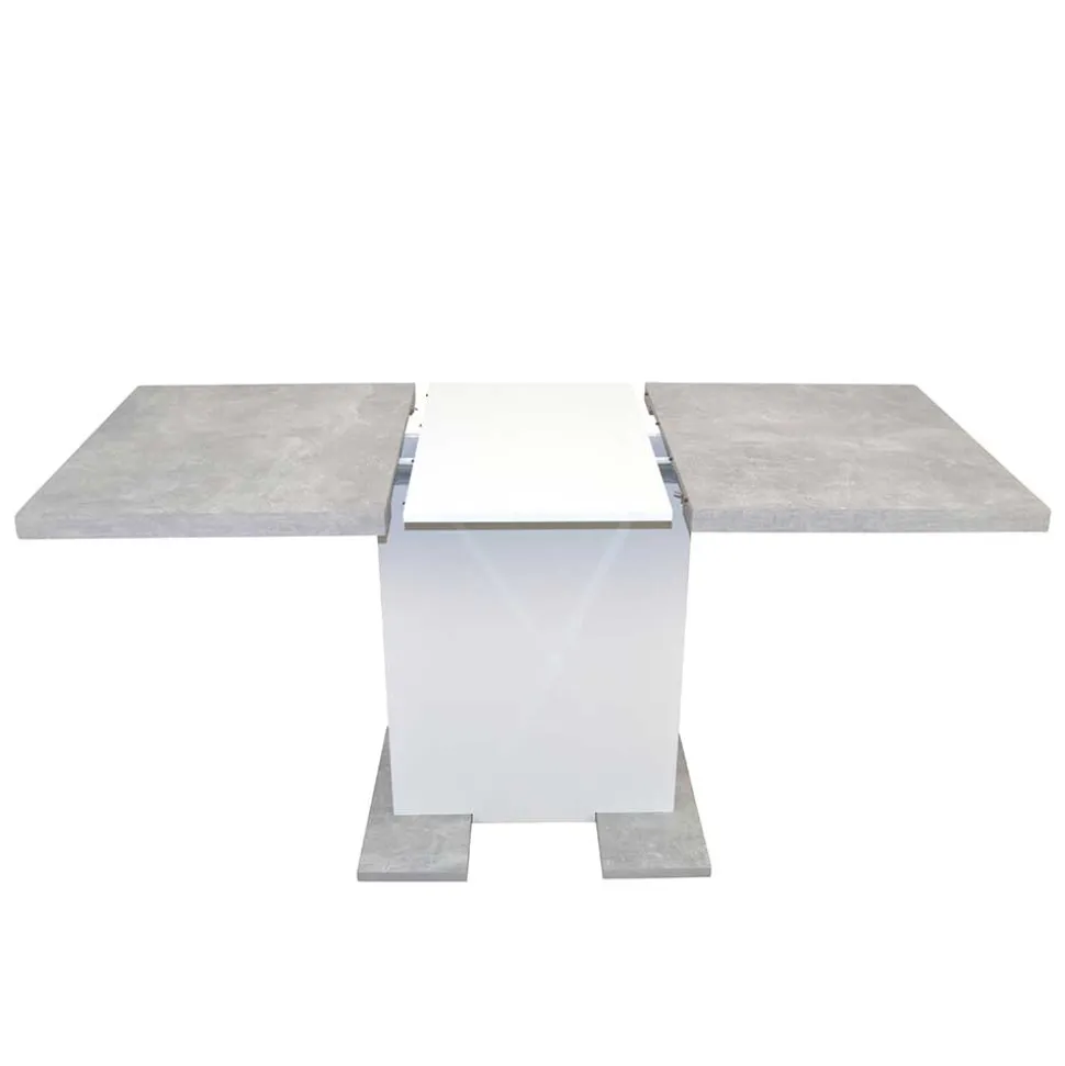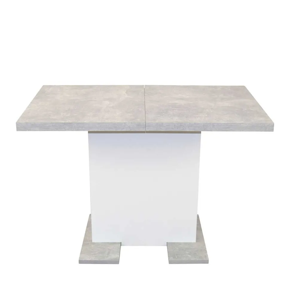 Modernität zeigt sich nicht nur in der Form, sondern auch im gekonnten Zusammenspiel der Materialien und Farben. Weiß, Chrom und eine authentisch wirkende Beton-Optik sorgen für eine kontrastreiche, urbane Ausstrahlung. Der Tisch mit seiner rechteckigen Form präsentiert sich in einer eleganten Mischung aus grauer Beton-Oberfläche und weiß melaminbeschichteten Flächen – ein spannendes Wechselspiel aus Struktur und Klarheit. Die Stühle greifen diesen Stil perfekt auf, mit weißem Kunstlederbezug und glänzend verchromten Metallgestellen. So entsteht ein harmonisches Gesamtbild, das sich nahtlos in moderne Wohnwelten einfügt und gleichzeitig markante Akzente setzt.