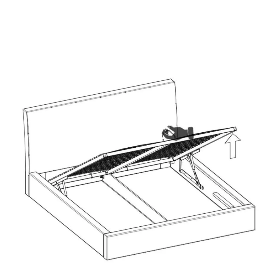 - Ein geräumiger Bettkasten, der in zwei Teile unterteilt ist, Öffnung am Fußende per Gaslift
