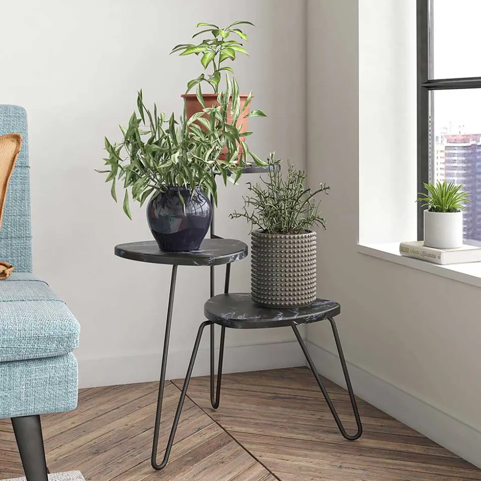 Die funktionale Gestaltung des „Haidon“ ermöglicht eine vielseitige Nutzung. Nutzen Sie die drei Etagen für verschiedene Pflanzen oder setzen Sie das Möbel als stilvolle Ablage in Szene. Die Retrooptik verleiht Ihrem Wohnraum dabei eine charmante Vintage-Note.