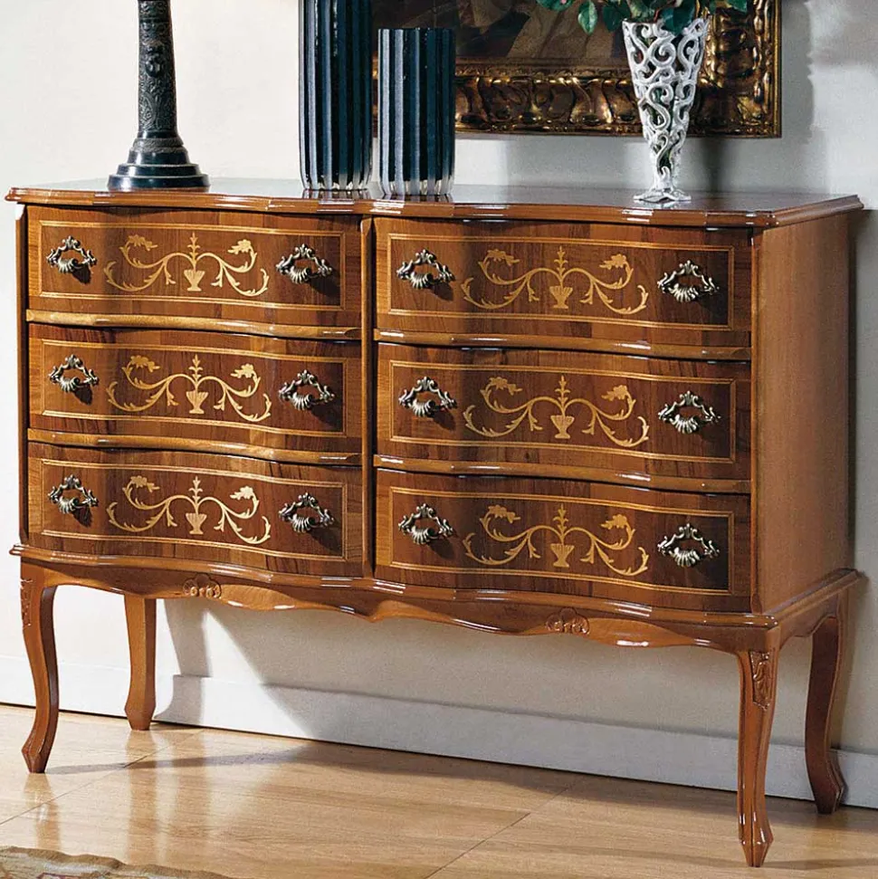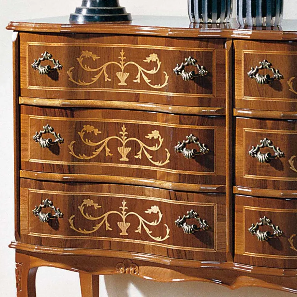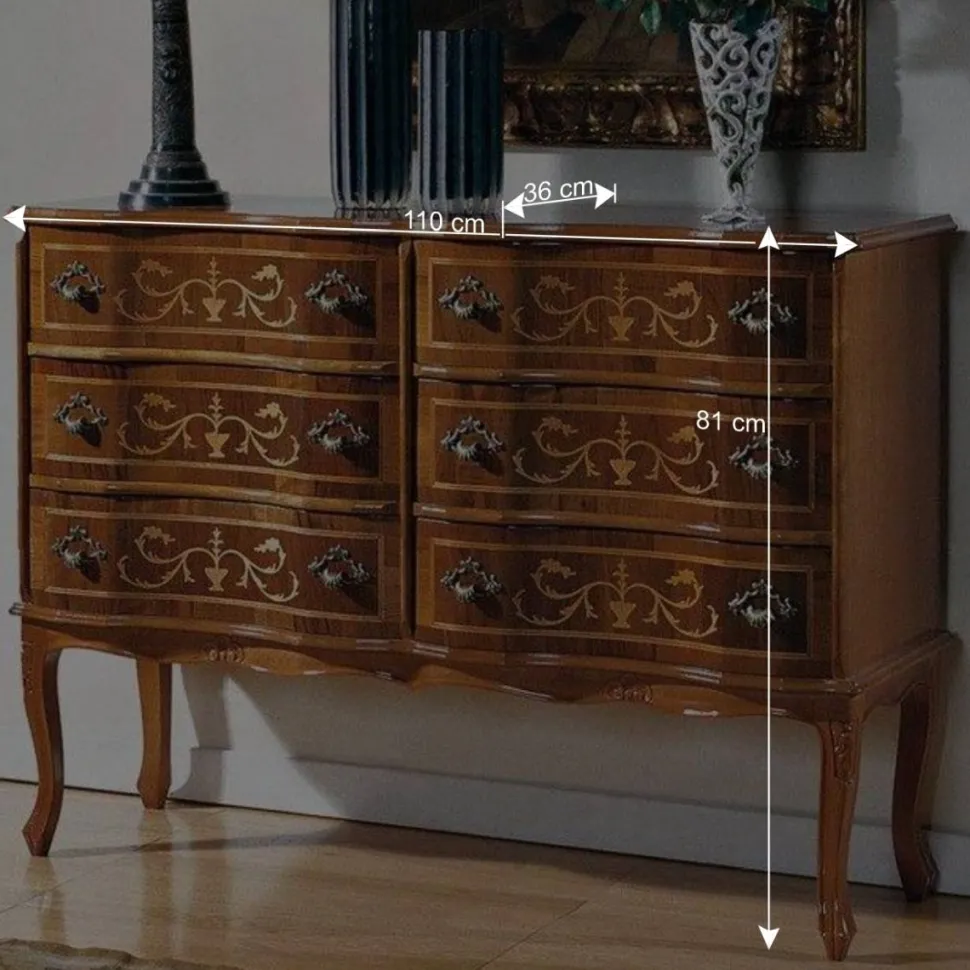 Die mit Nussbaumholz furnierten MDF-Oberflächen strahlen Wärme und Eleganz aus. Furniere verleihen der Kommode eine hochwertige Optik und schützen sie zusätzlich vor Abnutzung. Die lackierten Holzoberflächen und kunstvoll handgearbeiteten Intarsien an der Schubladenfront unterstreichen den luxuriösen Charakter des Möbelstücks.