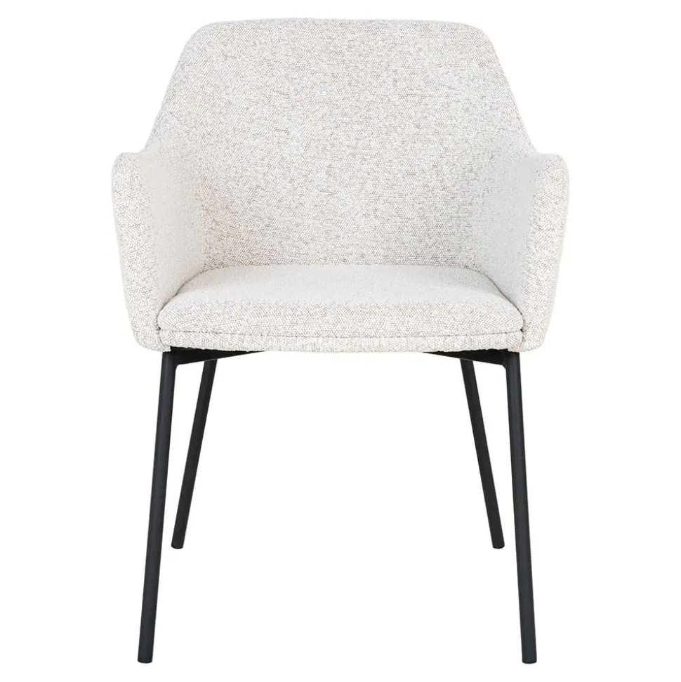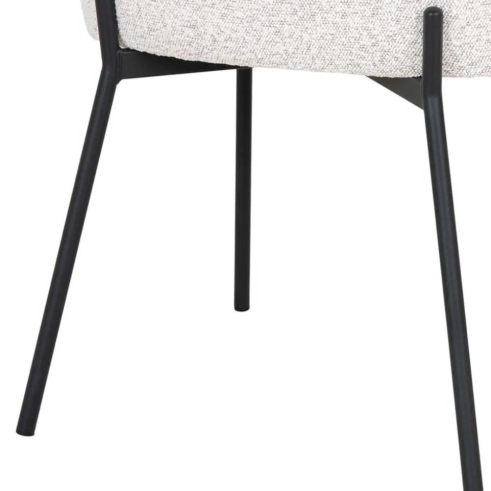 Der Bezug des Stuhls besteht aus Boucle-Stoff, einem Material aus 100 % Polyester, das nicht nur angenehm weich, sondern auch pflegeleicht ist. Die Schaumstoffpolsterung sorgt für ein komfortables Sitzgefühl, während die leicht geschwungenen Armlehnen zusätzlichen Halt bieten. Die Rückenlehne ist leicht nach hinten geneigt und garantiert so eine bequeme Sitzposition, die auch bei längeren Sitzzeiten für Entspannung sorgt.