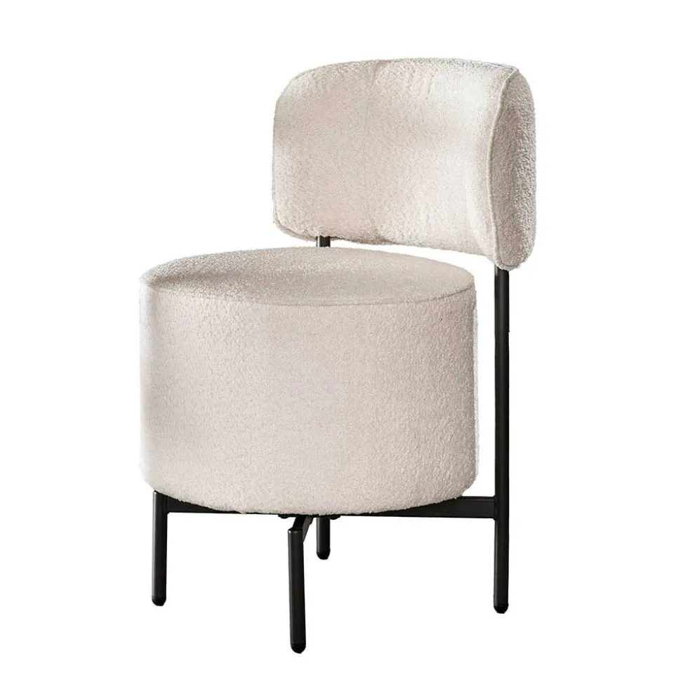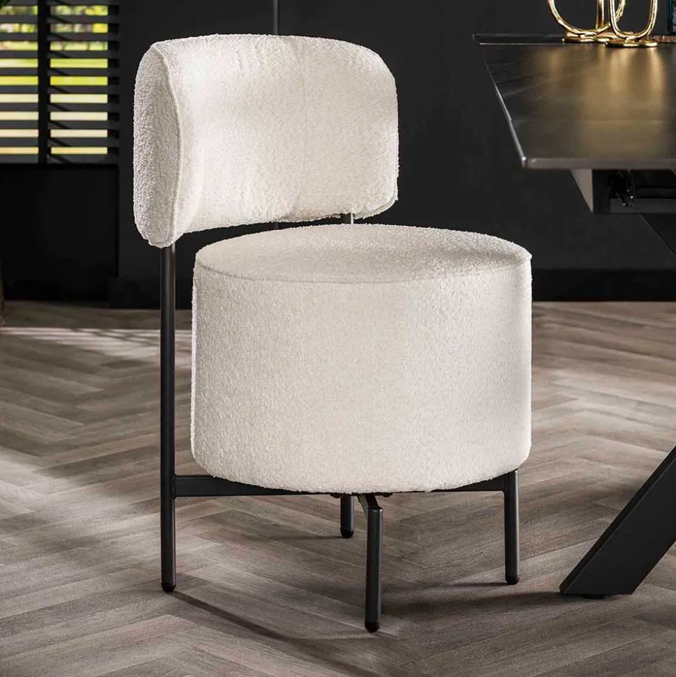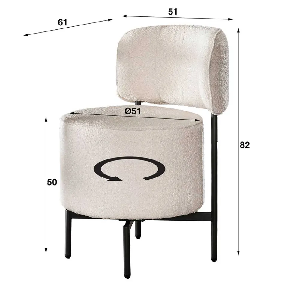 Das weiche, leicht strukturierte Bouclé-Gewebe (100 % Polyester) lädt geradezu zum Anfassen ein. Es schmeichelt den Fingerspitzen und verleiht dem Stuhl eine luxuriöse Anmutung. Bouclé ist zudem strapazierfähig, pflegeleicht und behält selbst bei täglicher Nutzung seine makellose Schönheit. Die zeitlose Farbe Weiß unterstreicht die stilvolle Ausstrahlung und lässt sich mühelos in jede Raumgestaltung integrieren.