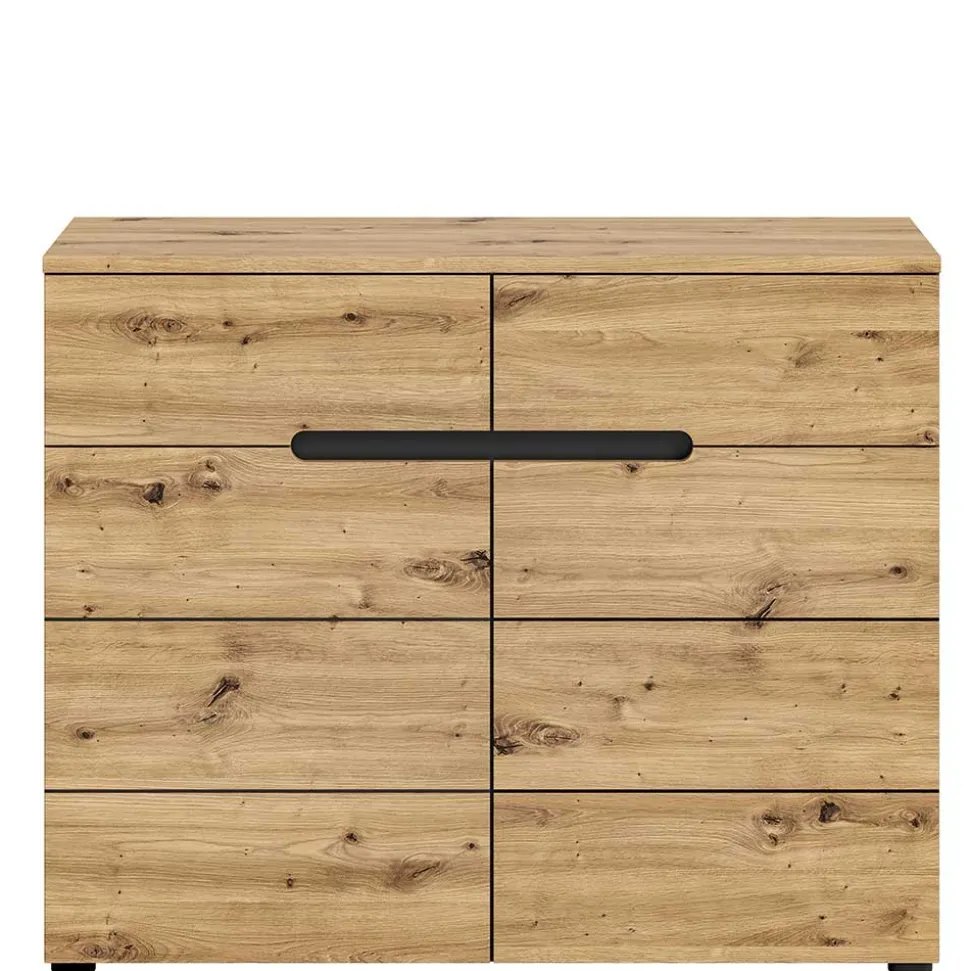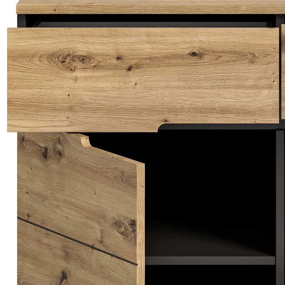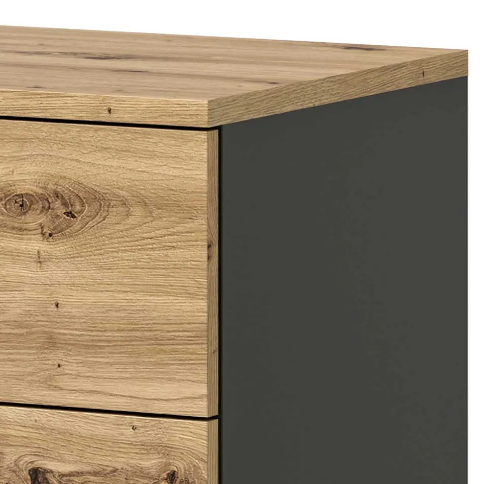 Gefertigt aus robuster Spanplatte, überzeugt die Kommode durch Stabilität und eine angenehme Haptik. Die melaminbeschichteten Oberflächen in Wildeiche-Optik und Grau sind nicht nur optisch ansprechend, sondern auch pflegeleicht und widerstandsfähig gegen alltägliche Beanspruchung. Die präzise Verarbeitung macht „Norja“ zu einem langlebigen Möbelstück für Ihr Zuhause.