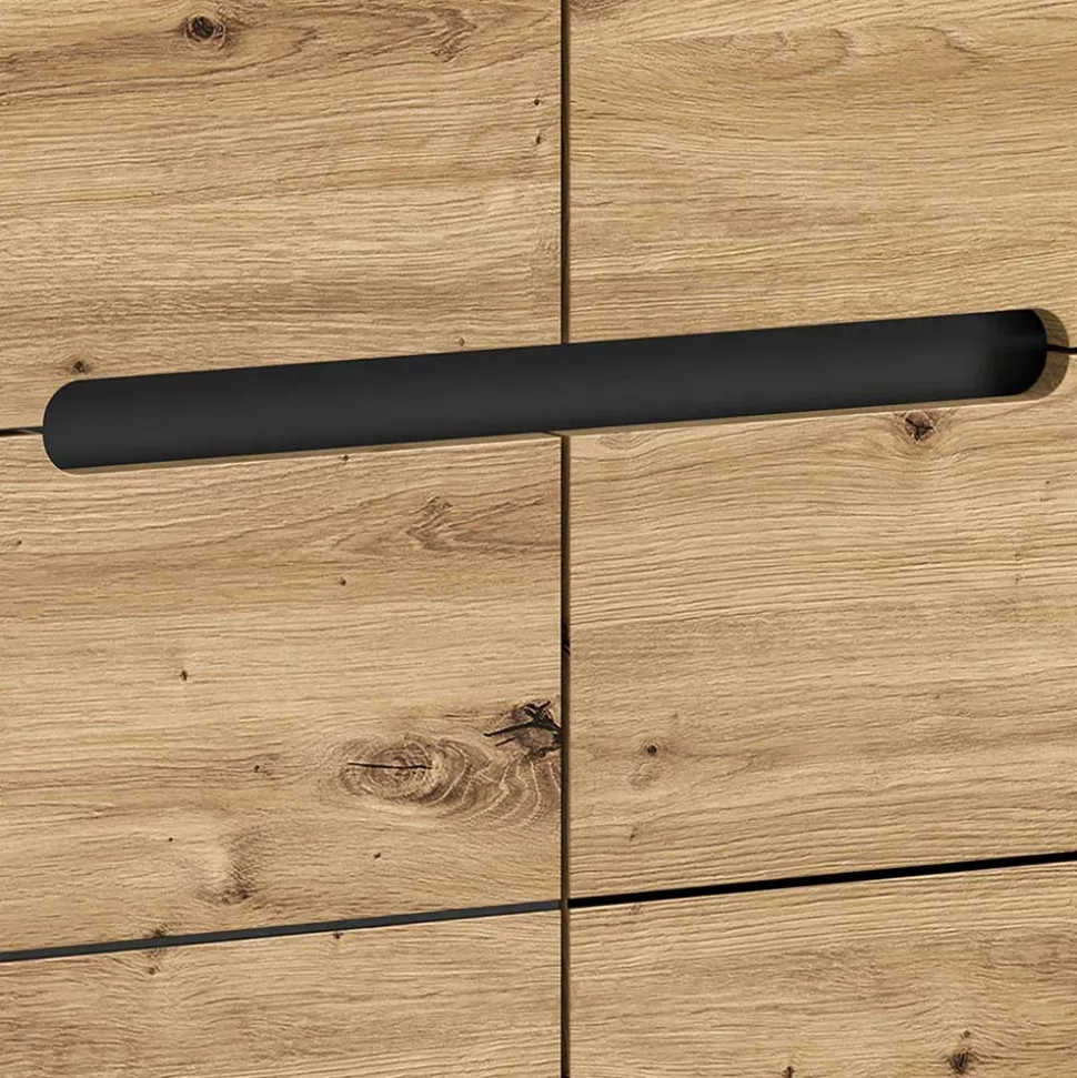Die breite Flurkommode „Norja“ verbindet Funktionalität mit ansprechendem Design und ist die perfekte Lösung für einen aufgeräumten Eingangsbereich. Ihr durchdachtes Stauraumkonzept bietet Platz für all die Dinge, die Sie im Alltag schnell zur Hand haben möchten – von Schlüsseln und Accessoires bis hin zu Schuhen oder Dokumenten. Die geschmackvolle Farbkombination aus warmer Wildeiche-Holzoptik und modernem Grau verleiht Ihrem Flur eine einladende Atmosphäre.