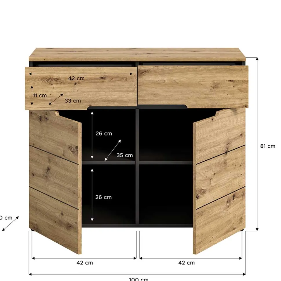 Die funktionale Anordnung der Stauraumelemente macht diese Kommode besonders praktisch: Zwei großzügige Schubladen im oberen Bereich bieten Platz für kleine Alltagsgegenstände, während die beiden Drehtüren darunter zusätzlichen Stauraum für größere Utensilien schaffen. Dank der verstellbaren Einlegeböden lässt sich der Innenraum flexibel an Ihre Bedürfnisse anpassen. Die Soft-Close-Beschläge sorgen zudem für ein geräuschloses Schließen der Türen.