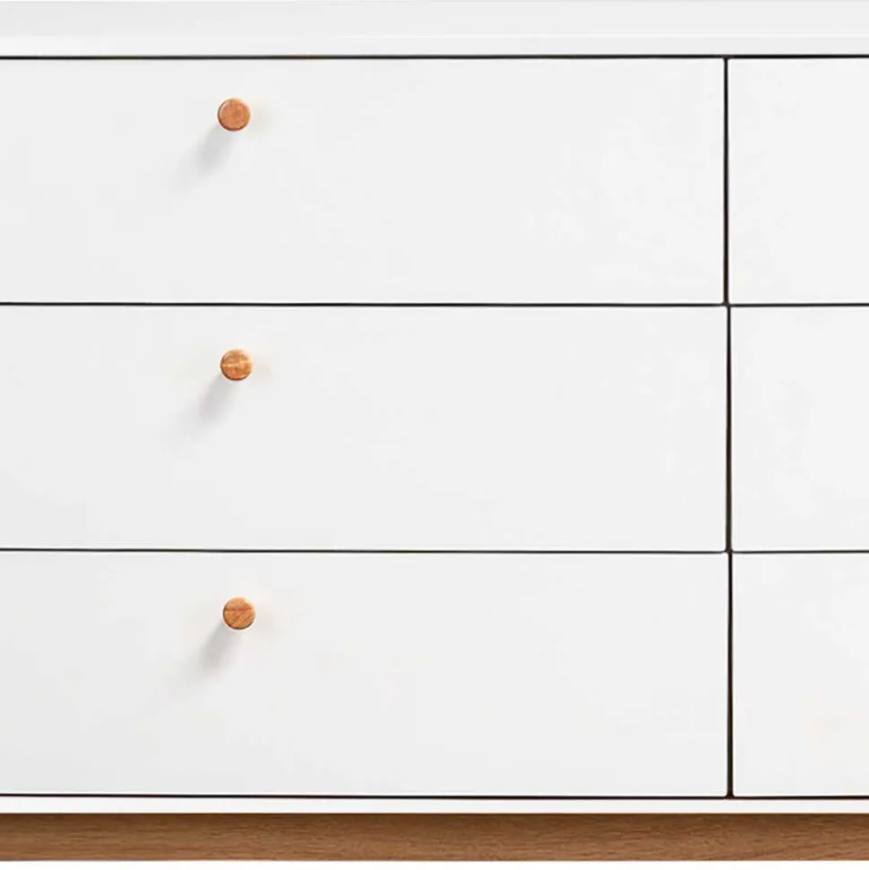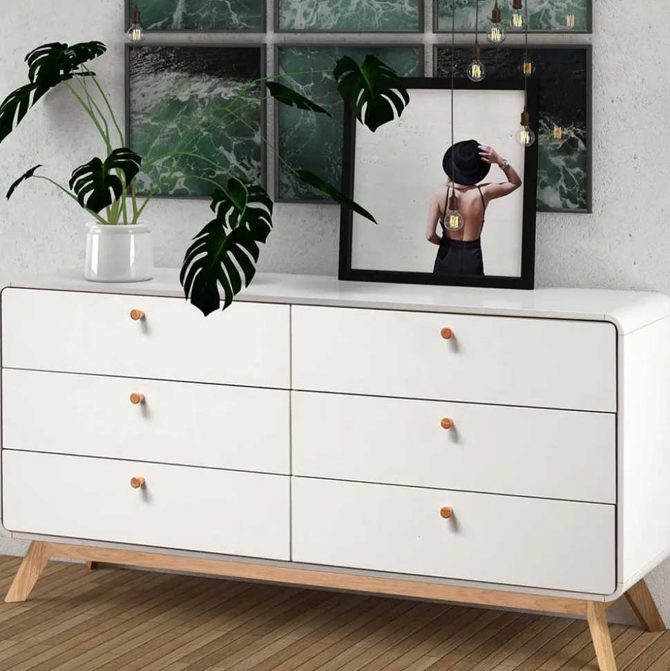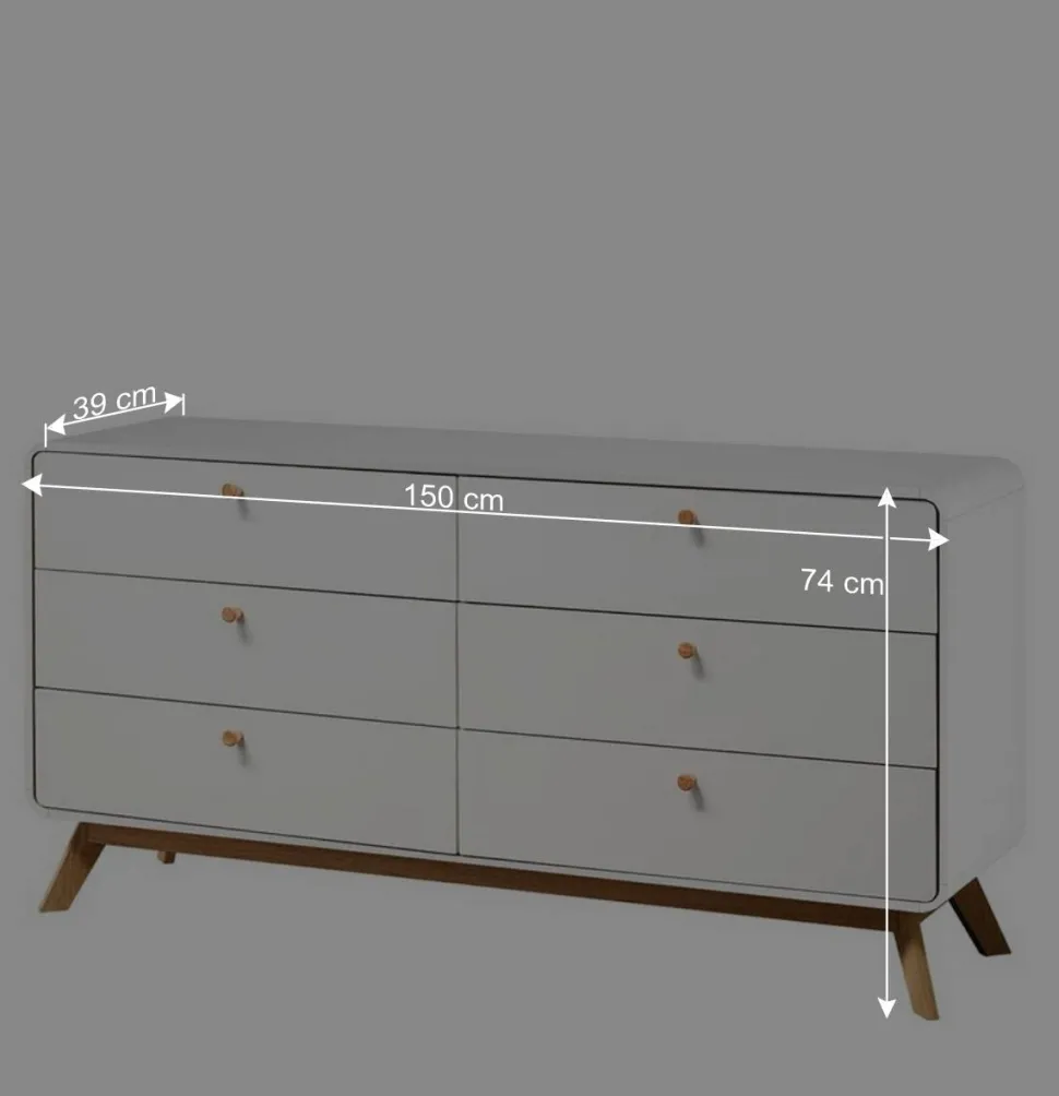 Mit einer Breite von 150 cm, einer Höhe von 74 cm und einer Tiefe von 39 cm bietet die Kommode großzügigen Stauraum, ohne dabei wuchtig zu wirken. Sechs geräumige Schubladen mit leichtgängigen Metallauszügen sorgen für eine geordnete Unterbringung von Kleidung, Dokumenten oder Alltagsgegenständen. Die runden Holz-Knopfgriffe unterstreichen das natürliche Design und ermöglichen ein bequemes Öffnen und Schließen der Schubladen.
