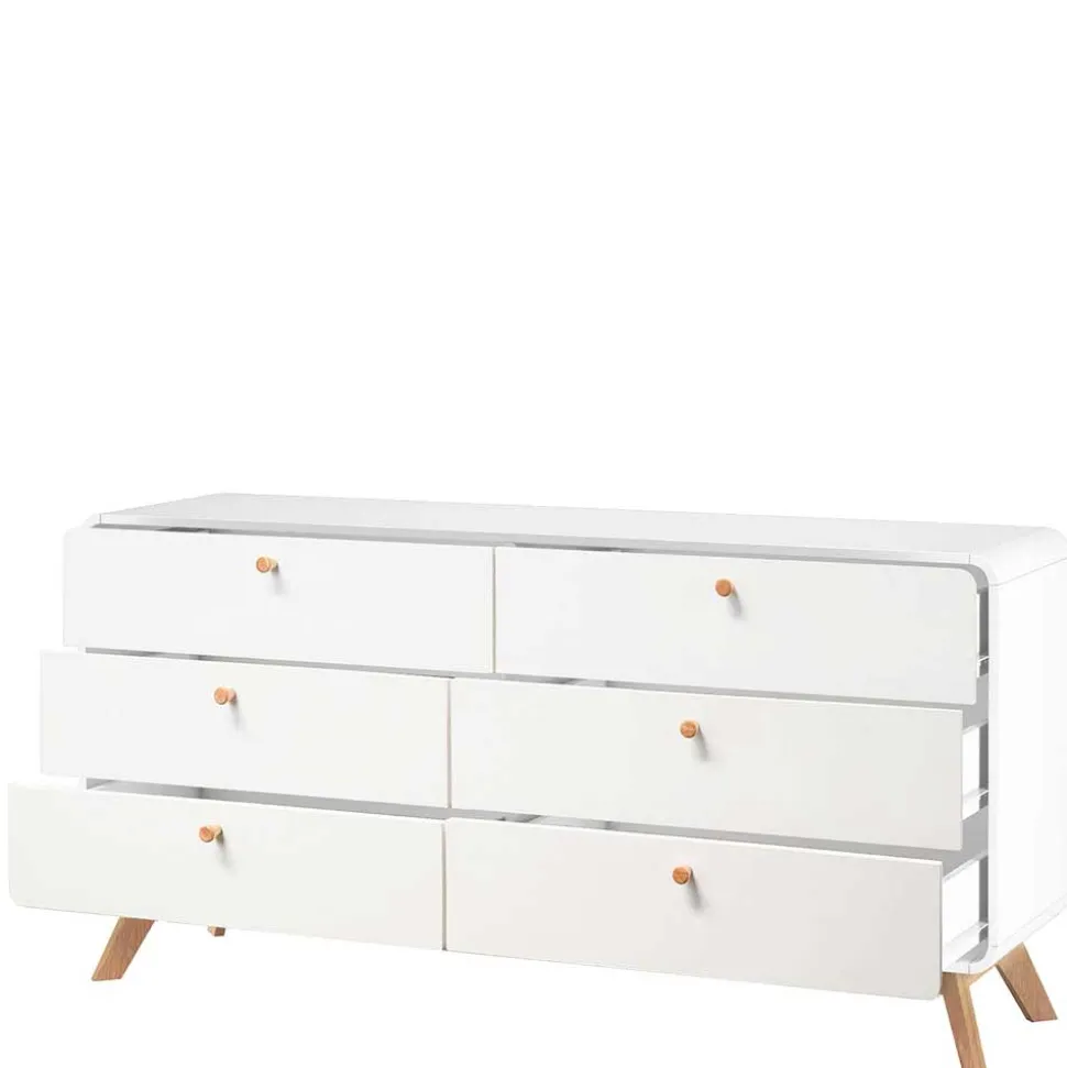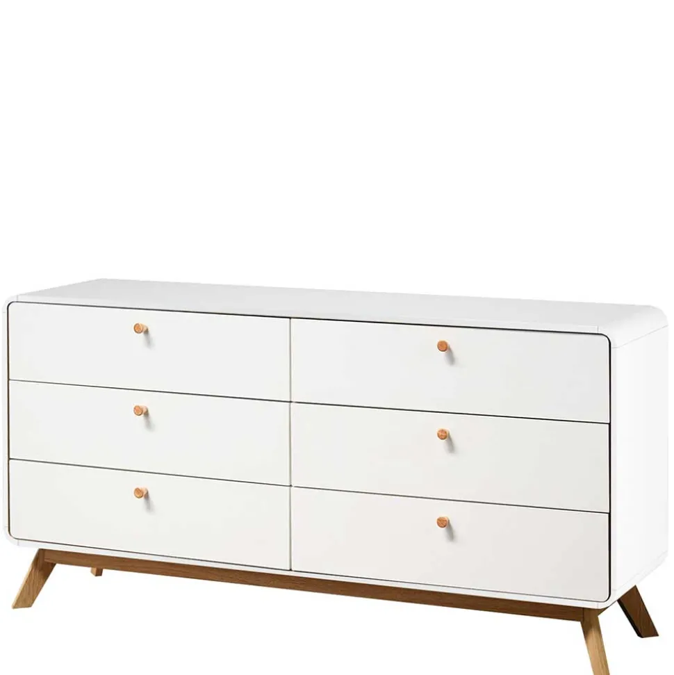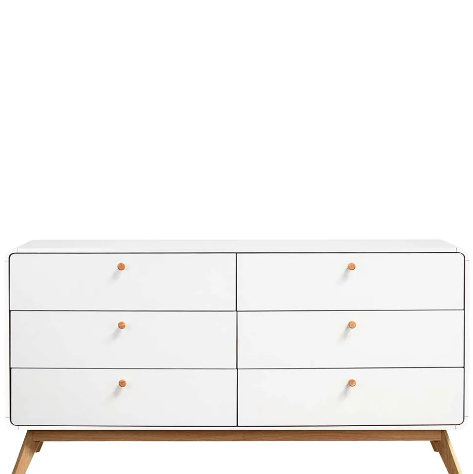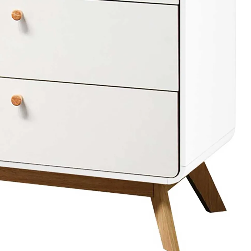 Ein besonderes Designelement sind die schräg gestellten Beine in Eichenholzoptik, die für den typischen skandinavischen Look sorgen. Sie setzen einen warmen, natürlichen Kontrast zum weißen Korpus und verleihen der Kommode eine leichte, fast schwebende Optik. Das Ergebnis ist ein Möbelstück, das sowohl modern als auch zeitlos wirkt und sich mühelos in verschiedenste Einrichtungsstile einfügt.