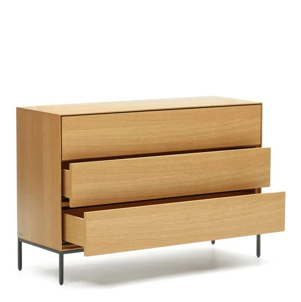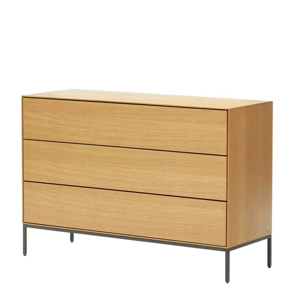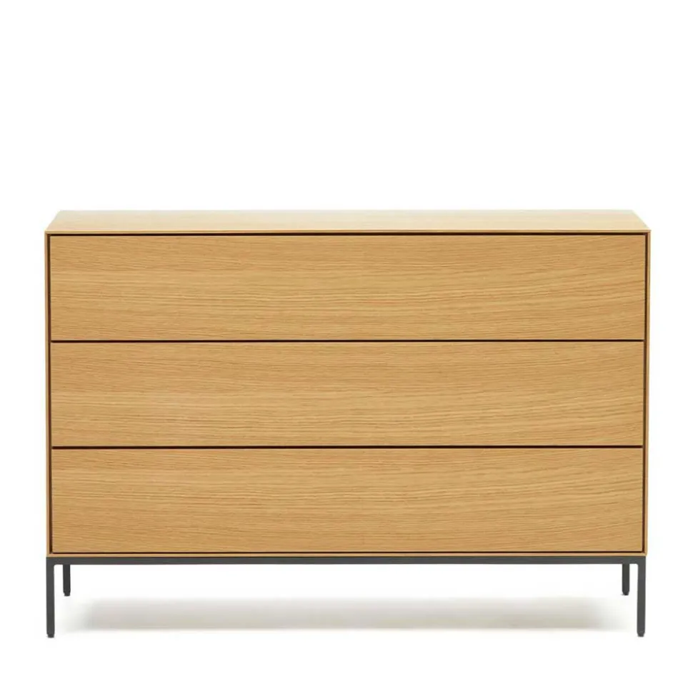 Das Gestell der Kommode besteht aus pulverbeschichtetem Stahl in matt Anthrazit. Die Pulverbeschichtung ist ein fortschrittliches Verfahren, bei dem ein trockener Pulverlack auf das Metall aufgetragen und dann bei hohen Temperaturen eingebrannt wird. Dieses Verfahren sorgt für eine besonders strapazierfähige und gleichmäßige Oberfläche, die gegen Kratzer, Korrosion und Abnutzung beständig ist. Das robuste Stahlgestell gewährleistet nicht nur einen stabilen Stand, sondern ermöglicht auch eine bessere Luftzirkulation und erleichtert das Reinigen unter der Kommode.