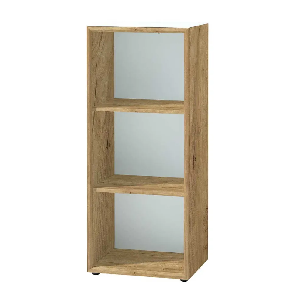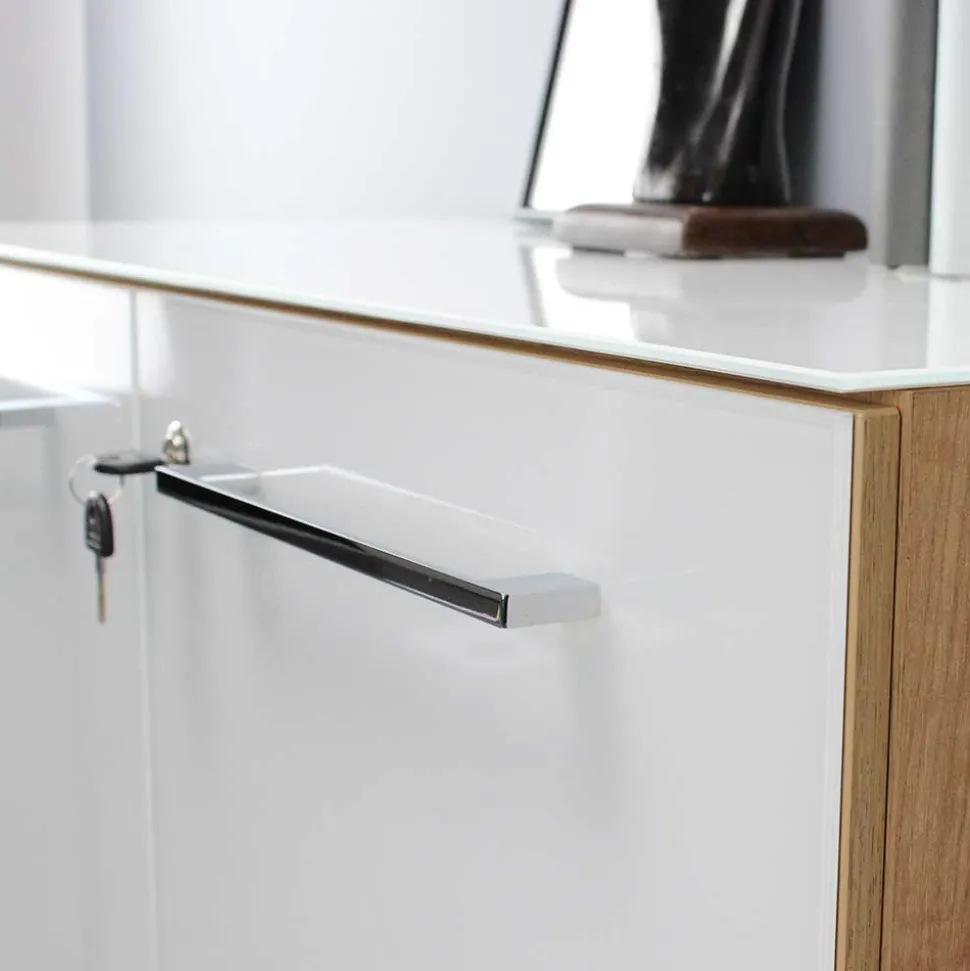 - Melaminbeschichtete Oberfläche in Weiß und in Holzoptik Wildeiche, Tür- und Schubladenfronten, Schreibtischfläche und Oberplatten zusätzlich mit Sicherheitsglas beschichtet