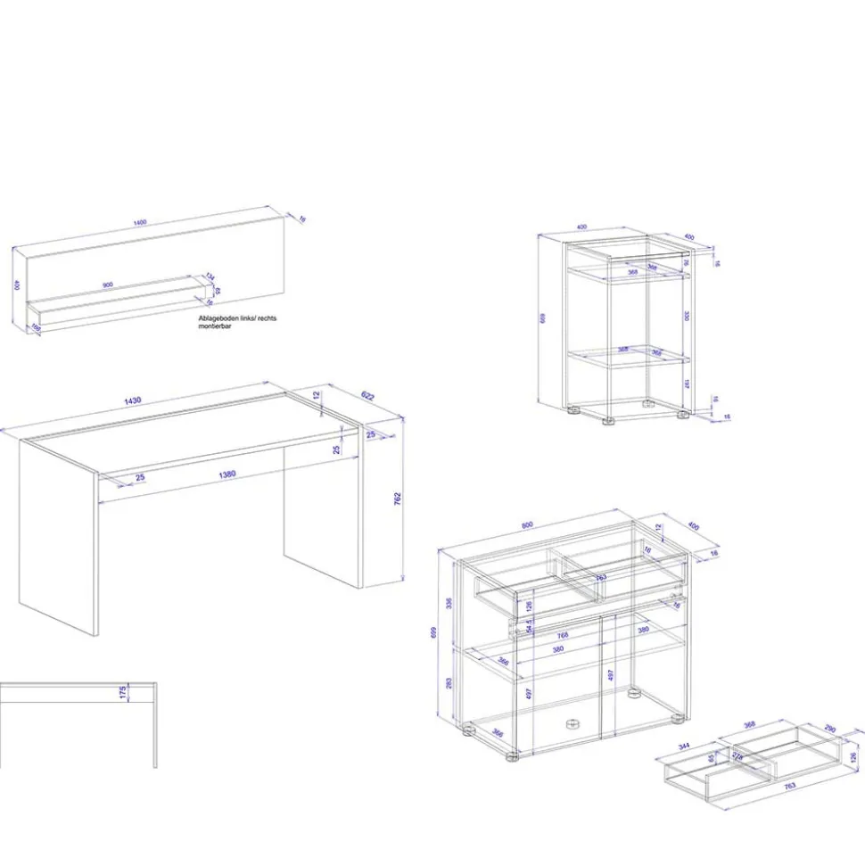 Die Korpusmöbel und der Schreibtisch stehen auf flachen Kunststoffgleitern. Diese bieten den Vorteil, dass sie den Boden schonen und gleichzeitig eine stabile Basis schaffen. Das Wandboard ist für eine platzsparende Wandmontage gedacht. Somit können die Möbel beliebig positioniert werden, um den verfügbaren Raum optimal zu nutzen.
