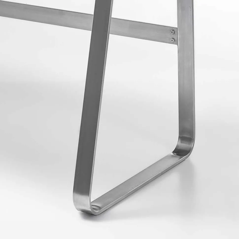 Ein besonderes Highlight ist das elegant geschwungene Kufengestell aus Metall in gebürsteter Edelstahloptik. Mit seiner modernen Linienführung setzt es visuelle Akzente und verleiht dem Tisch eine schwebende Leichtigkeit. Die stabile Querstrebe sorgt dabei für zusätzliche Festigkeit und Langlebigkeit. Mit einer Breite von 50 mm wirkt das Gestell kraftvoll und dezent zugleich – ein wahres Meisterstück moderner Möbelkunst.