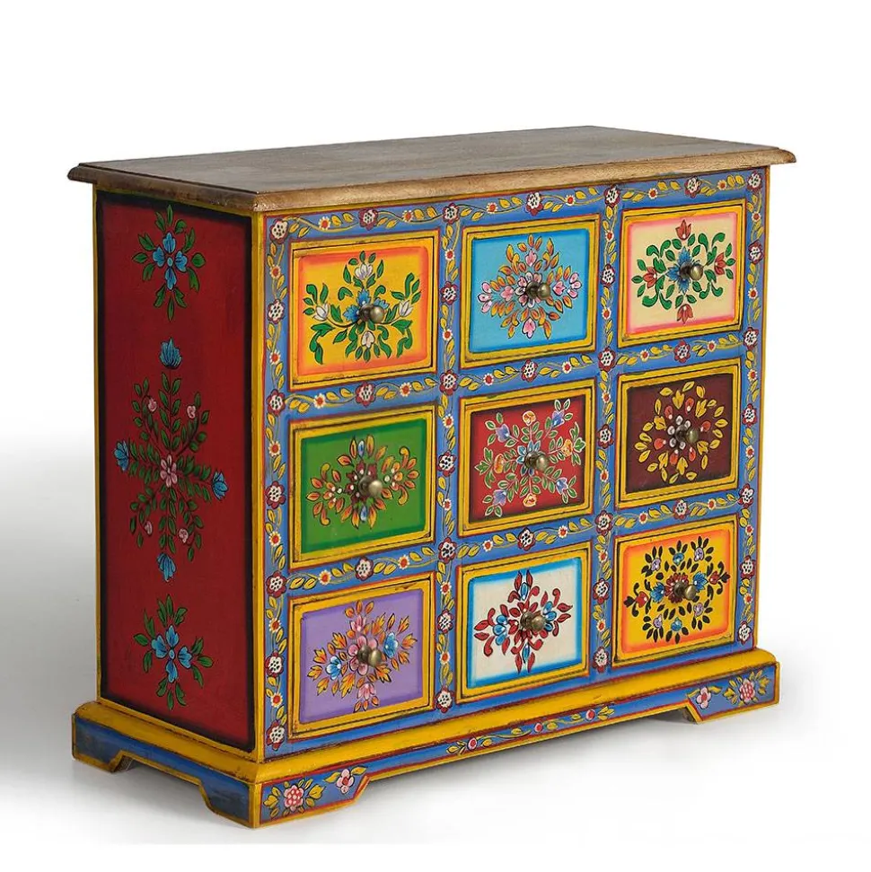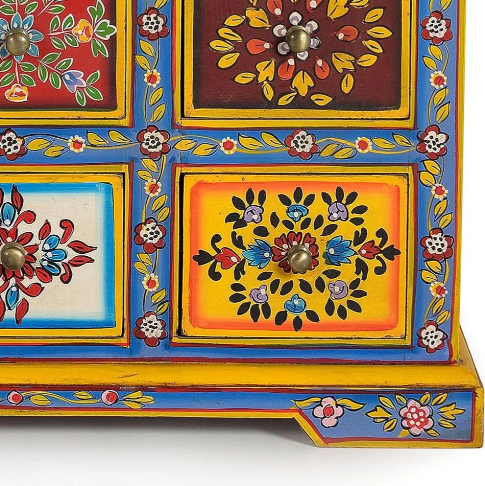 - Neun Schubladen mit Holzauszug, Fronten jeweils ca. 17×12 cm (BxH)