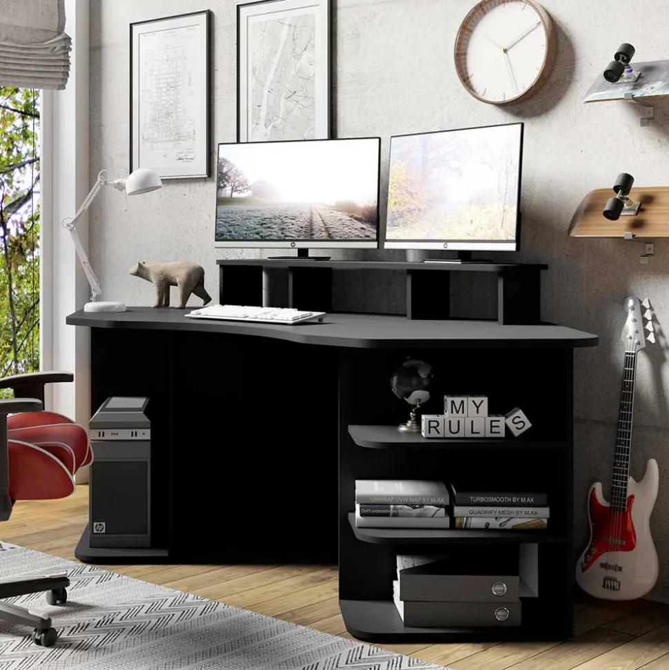 Dieses Möbelstück überzeugt nicht nur durch sein ästhetisches Äußeres, sondern auch durch durchdachte Funktionen. Ein Bildschirmaufsatz für zwei Monitore sowie ein Towerfach und drei offene Regalfächer bieten ausreichend Stauraum und Ordnung. Die Gesamtbelastbarkeit des Tisches beträgt beeindruckende 40 kg, was höchsten Ansprüchen gerecht wird.