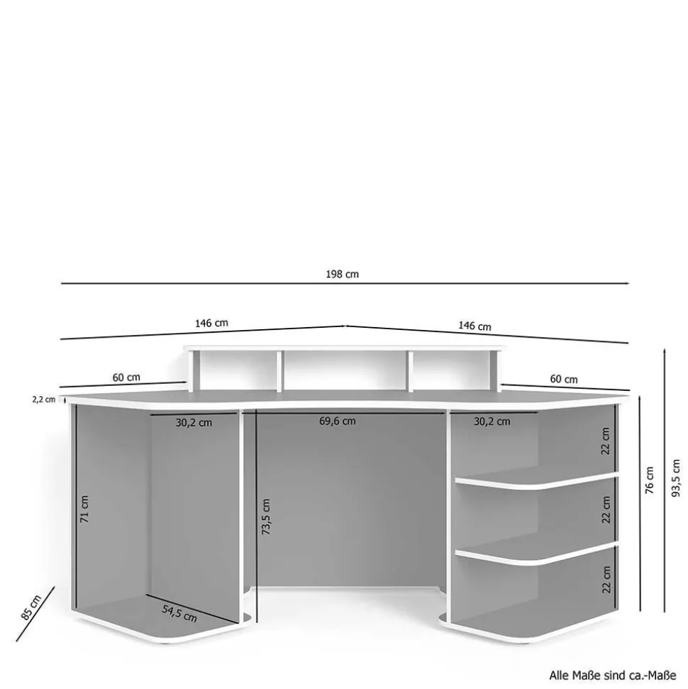 Der Computertisch „Iscian“ vereint Funktionalität mit modernem Design und ist die ideale Ergänzung für Ihr Gaming-Zimmer oder Home Office. Mit seiner halbrunden Form und einer Länge von je 146 cm pro Schenkel setzt dieser PC-Schreibtisch nicht nur optisch Akzente, sondern überzeugt auch durch seine durchdachte Konstruktion.