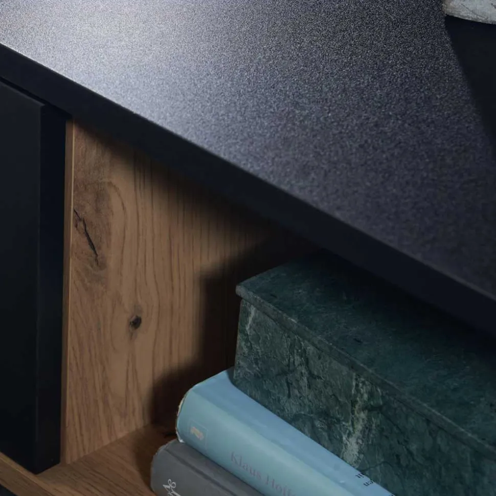Die Oberflächen des Couchtisches sind in eleganter Eicheholzoptik und modernem Schwarz foliert sowie melaminbeschichtet. Die Folierung verleiht dem Tisch ein hochwertiges Aussehen, das kaum von echtem Holz zu unterscheiden ist. Dieser Prozess sorgt nicht nur für eine ästhetisch ansprechende Optik, sondern schützt auch das Material vor äußeren Einflüssen. Die Melaminbeschichtung ist ein weiterer Pluspunkt: Diese widerstandsfähige Kunststoffschicht macht den Tisch besonders unempfindlich gegenüber Kratzern, Feuchtigkeit und Hitze. Dadurch behält der „Heraklion“ über viele Jahre hinweg sein makelloses Aussehen.
