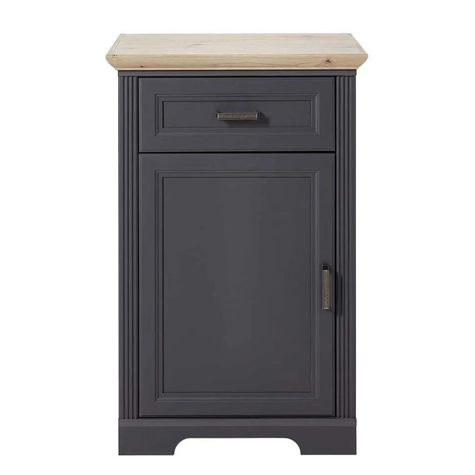 Die Oberflächen in matt Anthrazit, kombiniert mit Absetzungen in Eichenholzoptik, schaffen einen modernen, jedoch zeitlosen Look. Die folierten Oberflächen bieten den Vorteil, dass sie besonders pflegeleicht und widerstandsfähig gegen Kratzer sind. Dekorative Fräsungen an den Frontseiten und eckige Korpuskanten fügen dem Gesamtbild eine raffinierte Note hinzu.